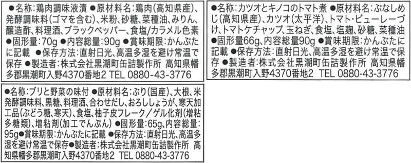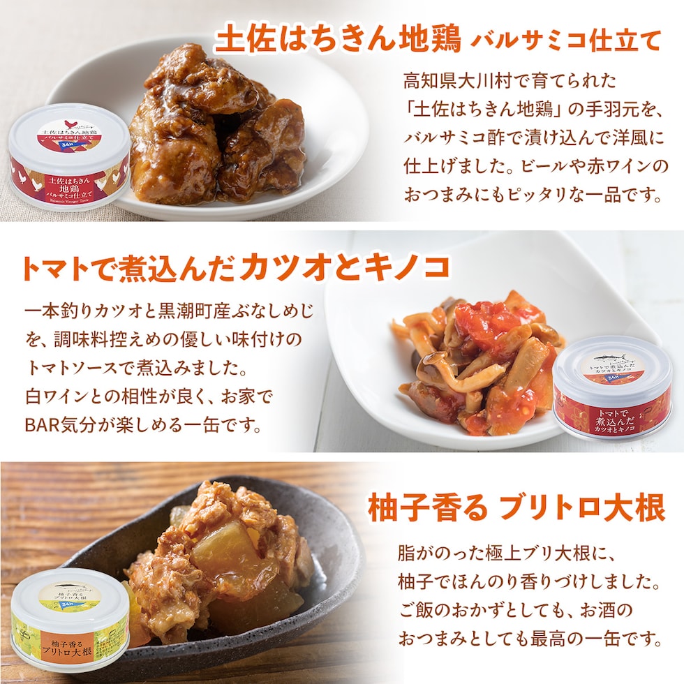 土佐はちきん地鶏バルサミコ仕立て 90g トマトで煮込んだ カツオとキノコ 90g 柚子香る ブリトロ大根 95g 3種 3缶 |