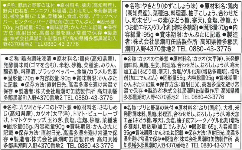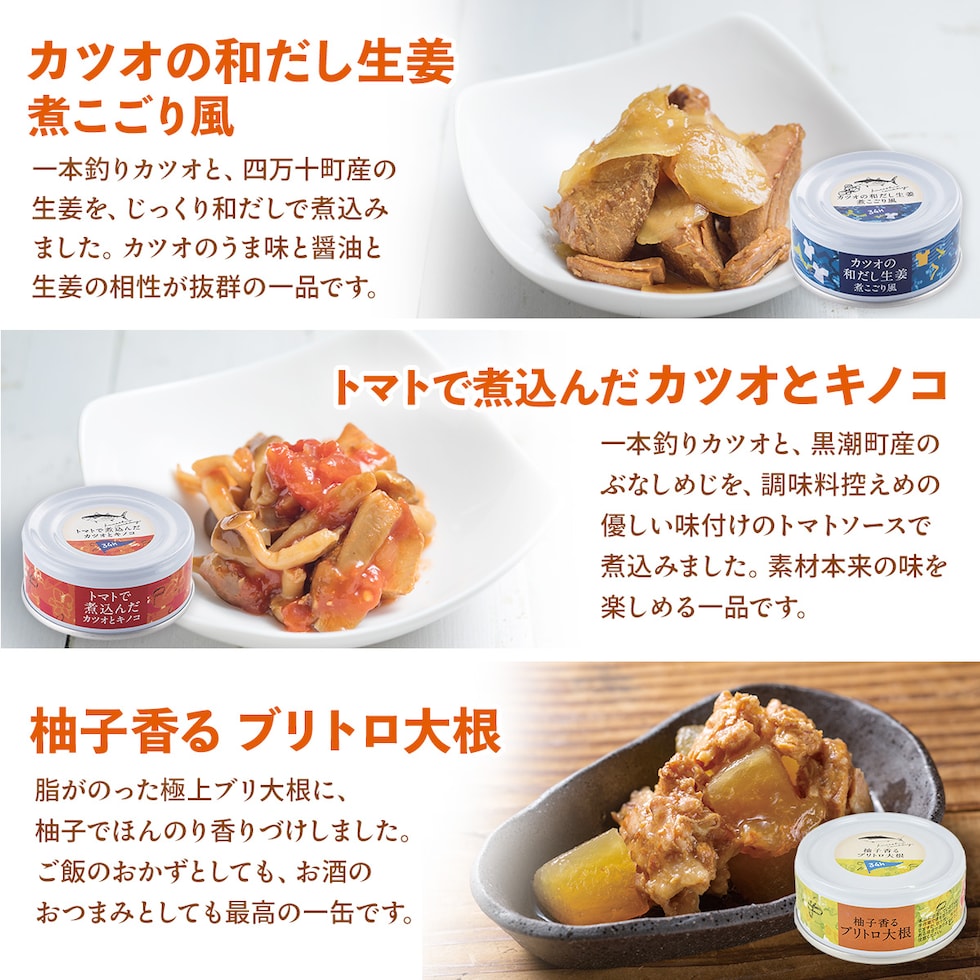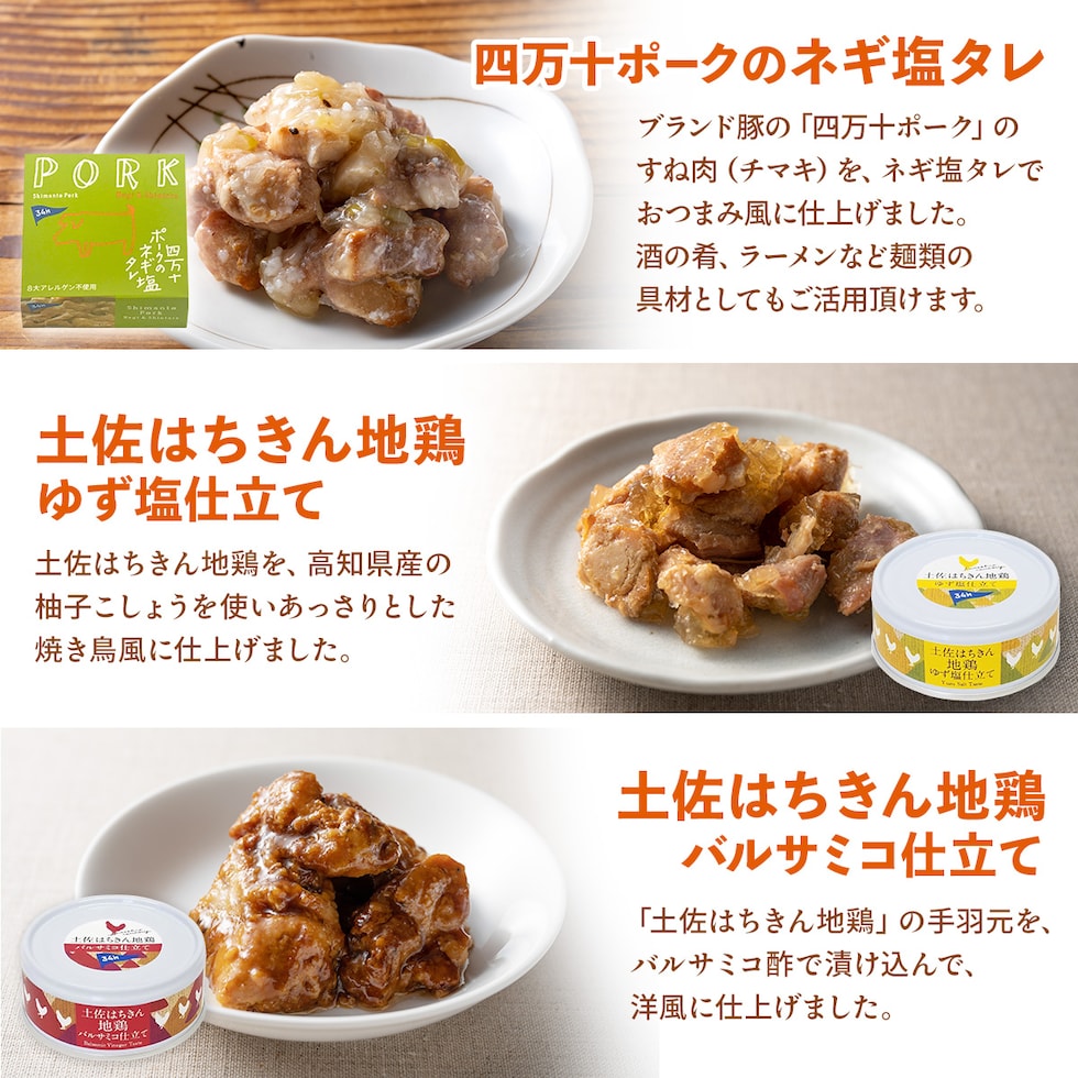 四万十ポークのネギ塩タレ 90g 土佐はちきん地鶏ゆず塩仕立て 95g 土佐はちきん地鶏バルサミコ仕立て 90g カツオの和だし生姜 煮こごり風 95g トマトで煮込んだ カツオとキノコ 90g 柚子香る ブリトロ大根 95g 6種 6缶 |