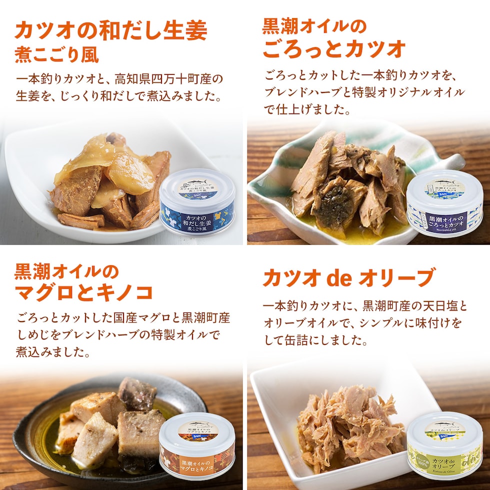 四万十ポークのネギ塩タレ 90g 土佐はちきん地鶏ゆず塩仕立て 95g 土佐はちきん地鶏バルサミコ仕立て 90g カツオと筍のアヒージョ 95g カツオの和だし生姜 煮こごり風 95g 黒潮オイルのごろっとカツオ 90g 黒潮オイルのマグロとキノコ 100g カツオdeオリーブ 90g トマトで煮込んだ カツオとキノコ 90g 柚子香る ブリトロ大根 95g 四万十産マヒマヒのマヨグラタン風 100g お魚のパテ グリーンペッパージュレ 100g 12種 12缶 |