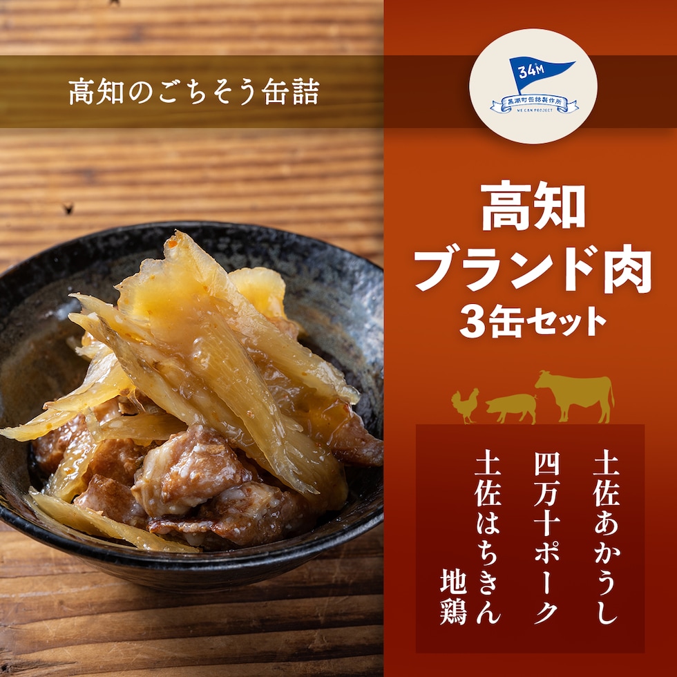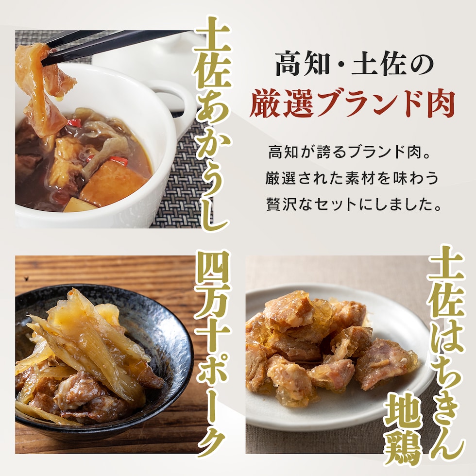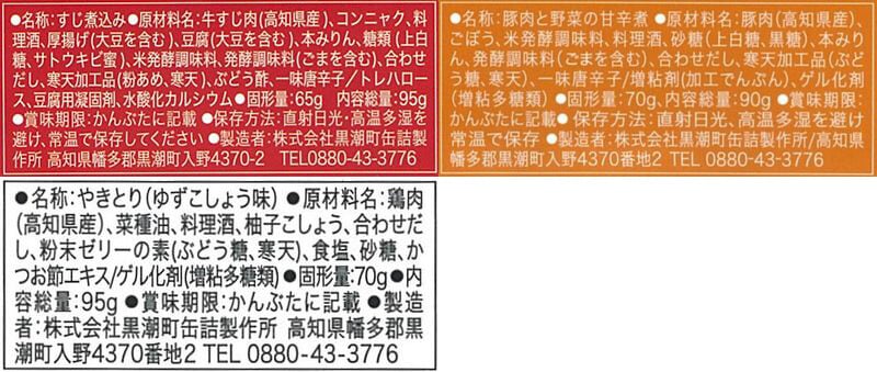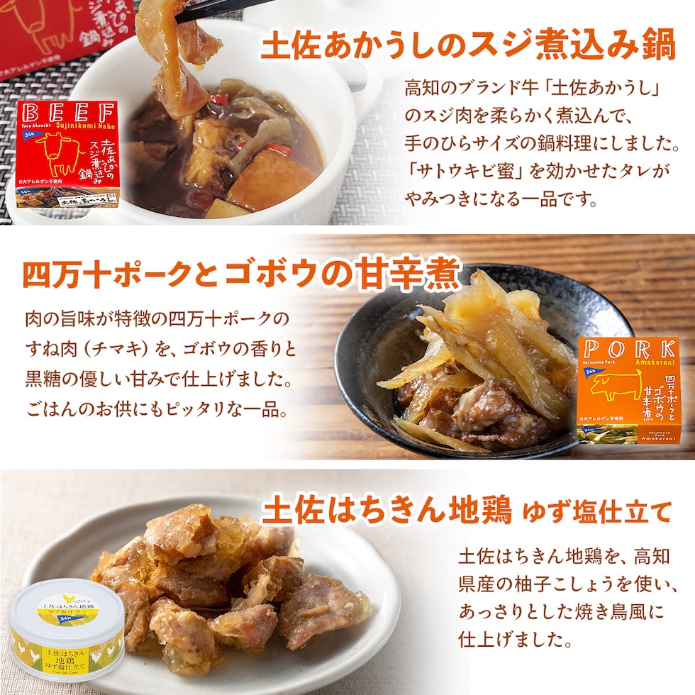 土佐あかうしのスジ煮込み鍋 95g 四万十ポークとゴボウの甘辛煮 90g 土佐はちきん地鶏ゆず塩仕立て 95g 3種 3缶 |