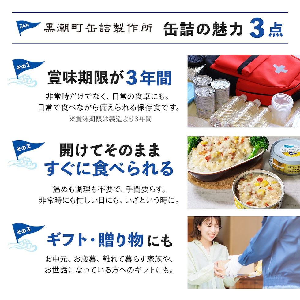 黒潮町缶詰製作所 高級 缶詰 おつまみ ご飯 鰹 と 海鮮 たっぷりの土佐流・玄米パエリア 3缶 詰め合わせ 非常食 でも 日常食 でも満足できる そのままで おつまみ に、 パスタ や パン に アレンジ 、 もしもの時の栄養源など すべてのシーンで活躍する 缶詰め 具材の旨味を引き出した グルメ缶詰 は、備蓄 としてだけでなく日常の おかず にもぴったり。 家族の備えとして、ギフトとしても喜ばれる高知発の缶詰です。