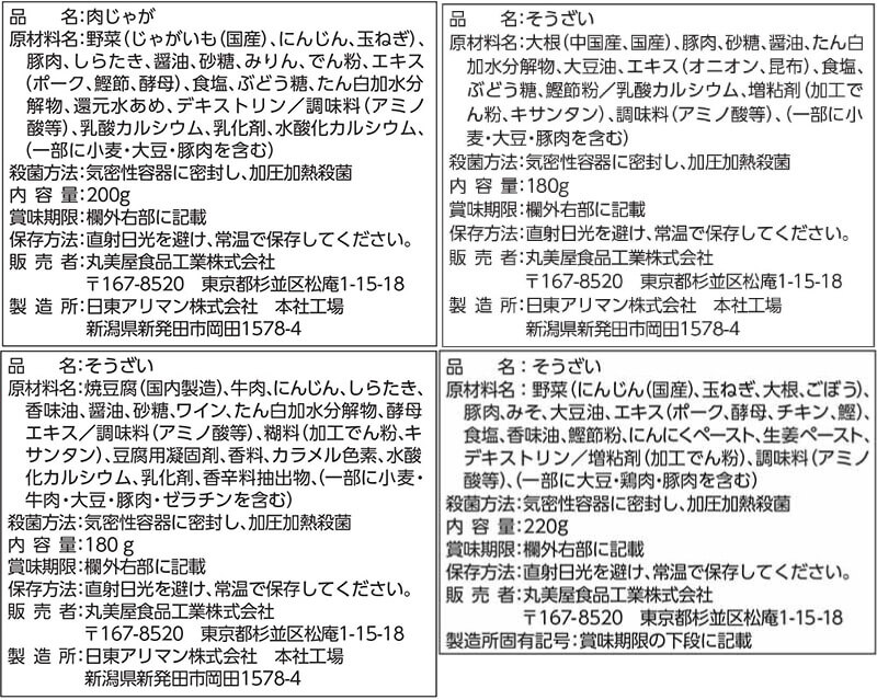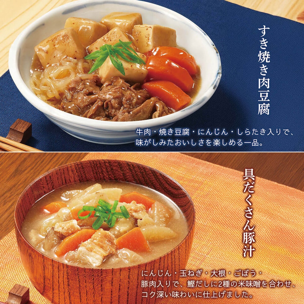 ■ レンジDELI 5種の具材入り肉じゃが 200g 豚バラ大根煮 180g すき焼き肉豆腐 180g 具だくさん豚汁 220g 4種 各3食 合計12食 |