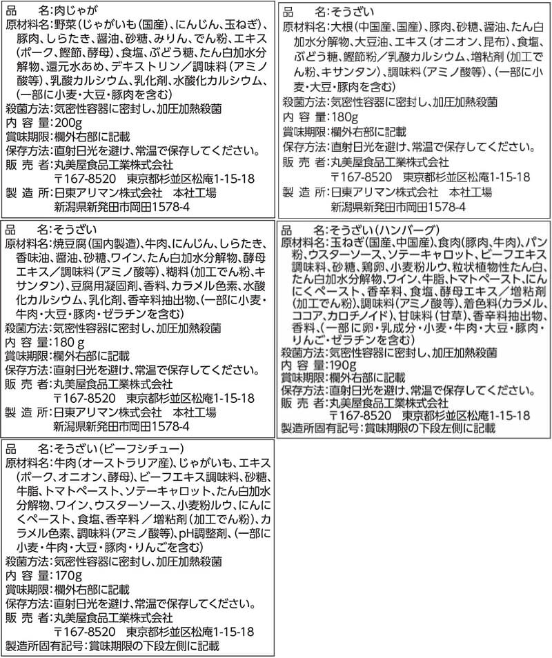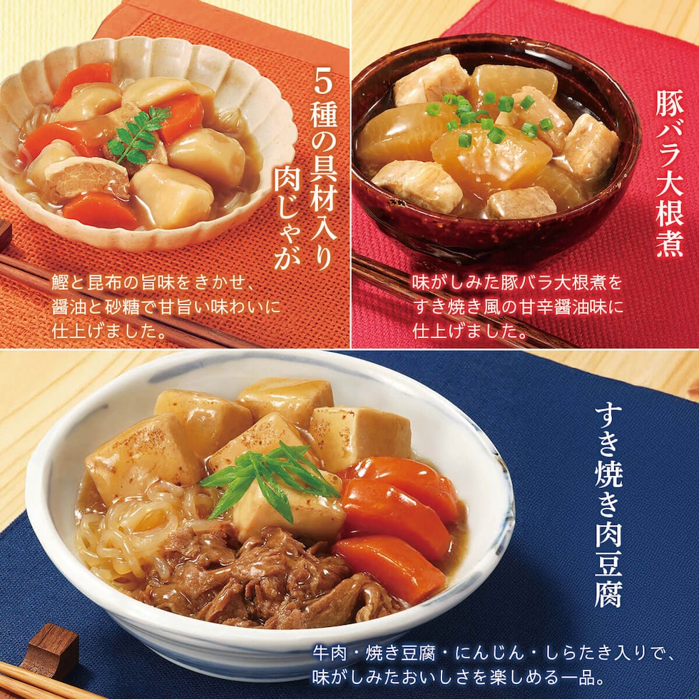■ レンジDELI 5種の具材入り肉じゃが 200g 豚バラ大根煮 180g すき焼き肉豆腐 180g 煮込みハンバーグ 190g 濃厚ビーフシチュー 170g 5種 各2食 合計10食 |