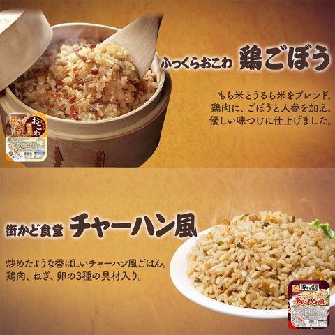 ■ ふっくらシリーズ 五目釜めし 160g とり釜めし 160g ■ ふっくらおこわ おこわ 鶏ごぼう 160g ■ 街かど食堂 チャーハン風 160g 4種 各2食 合計8食 |