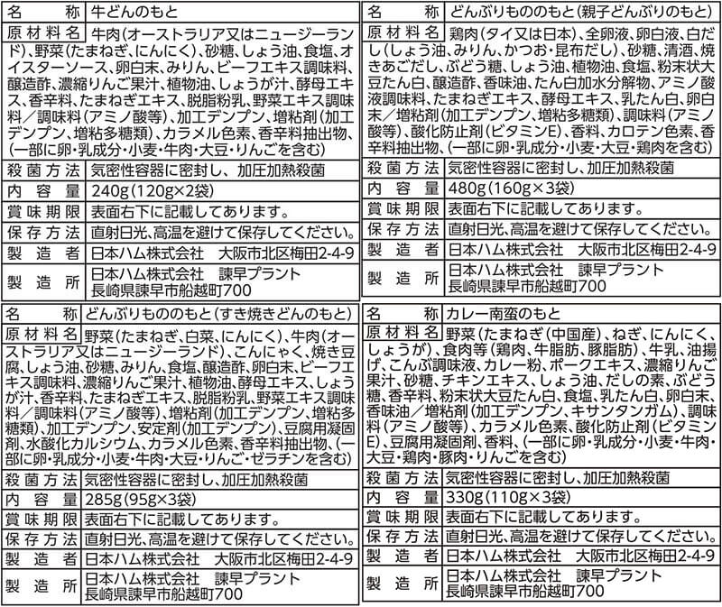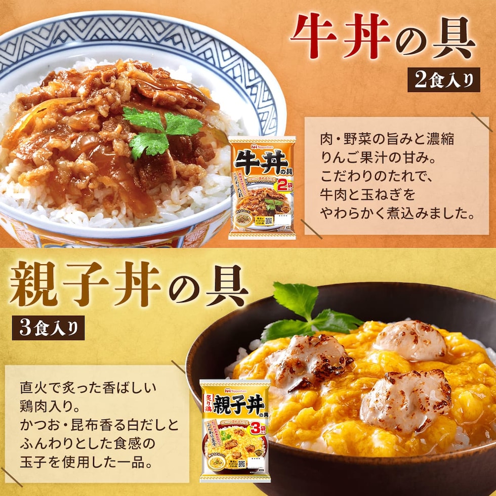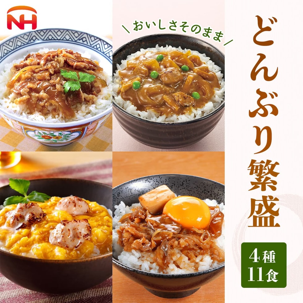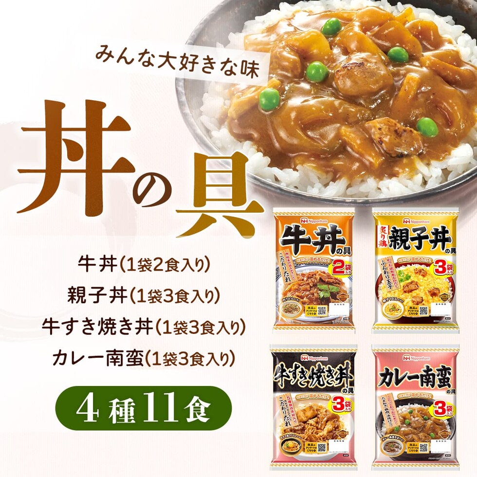 ■ どんぶり繁盛 (1袋 2食入) 牛丼の具 120g ■ どんぶり繁盛 (1袋 3食入) 親子丼の具 160g 牛すき焼き丼の具 95g カレー南蛮の具 110g 各1袋 4種 11食 |