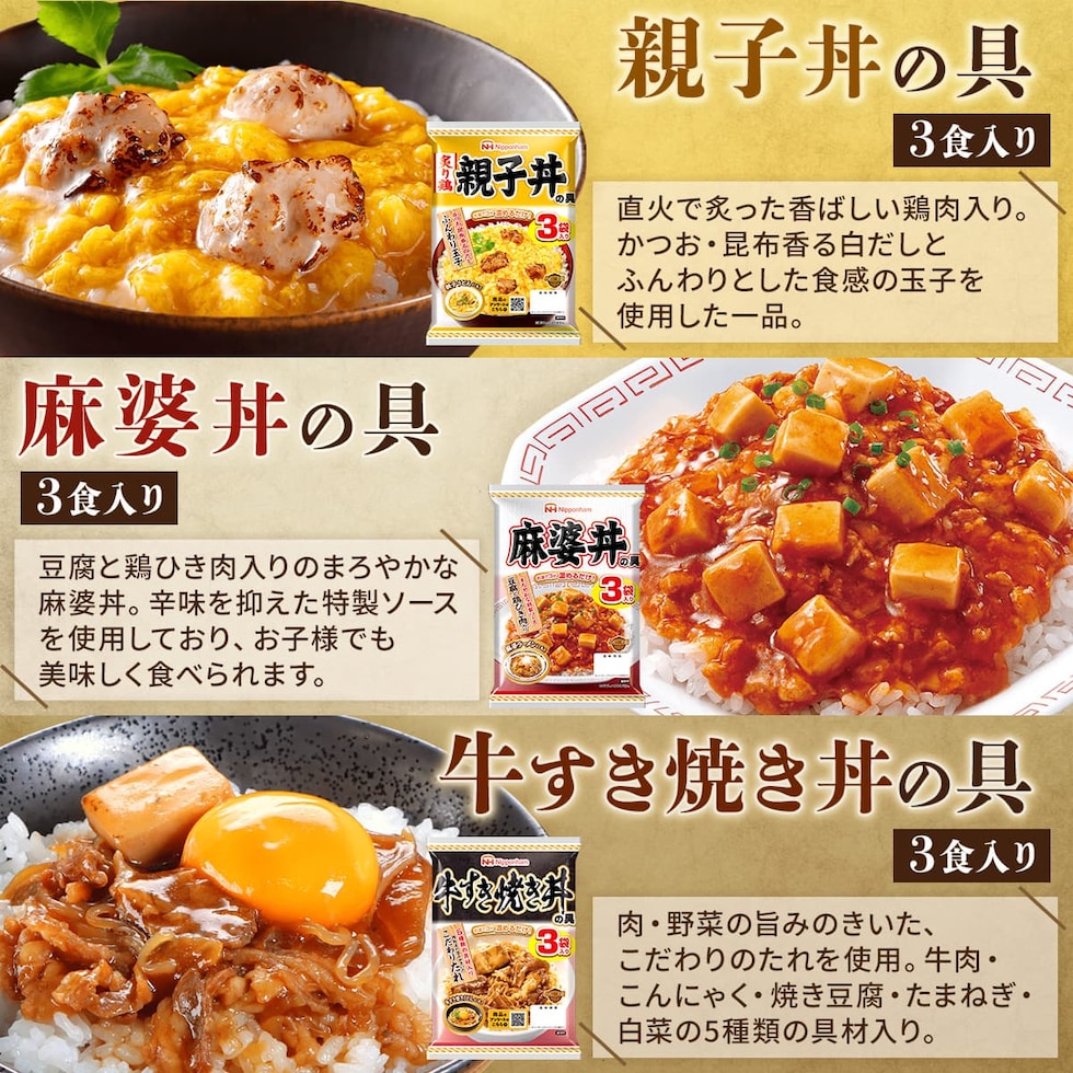 日本ハム レトルト 食品 どんぶり繁盛 丼の具 詰め合わせ セット レンジ 湯煎 で 温めるだけ ご飯 にかけて 美味しい 牛丼 / 親子丼 / 中華丼 / 麻婆丼 / 牛すき焼き丼 ご飯 だけでなく うどん や ラーメン にかけて アレンジするのも おすすめ ! 忙しい時やご飯を作るのが面倒な時に役立つ 便利 な レトルト食品 です。