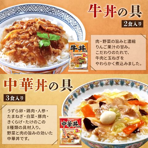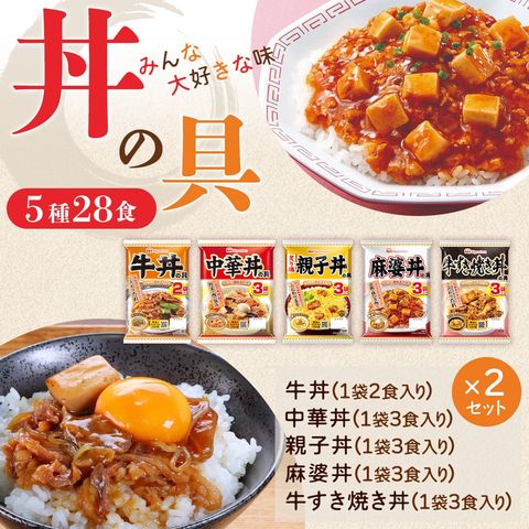 ■ どんぶり繁盛 (1袋 2食入) 牛丼の具 120g ■ どんぶり繁盛 (1袋 3食入) 中華丼の具 138g 親子丼の具 160g 麻婆丼の具 140g 牛すき焼き丼の具 95g 各2袋 5種 28食 |