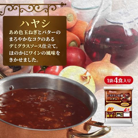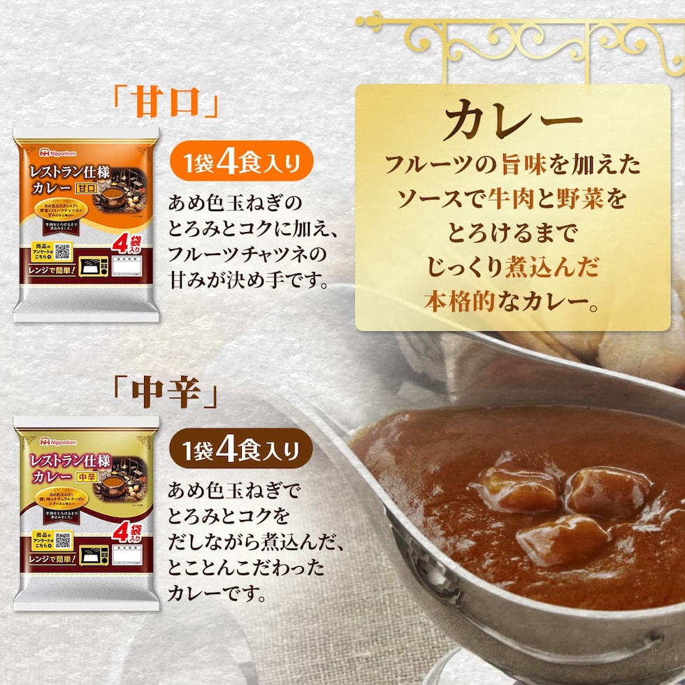 ■ レストラン仕様 (1袋 4食入) カレー 甘口 170g カレー 中辛 170g ハヤシ 135g 各1袋 3種 12食 |