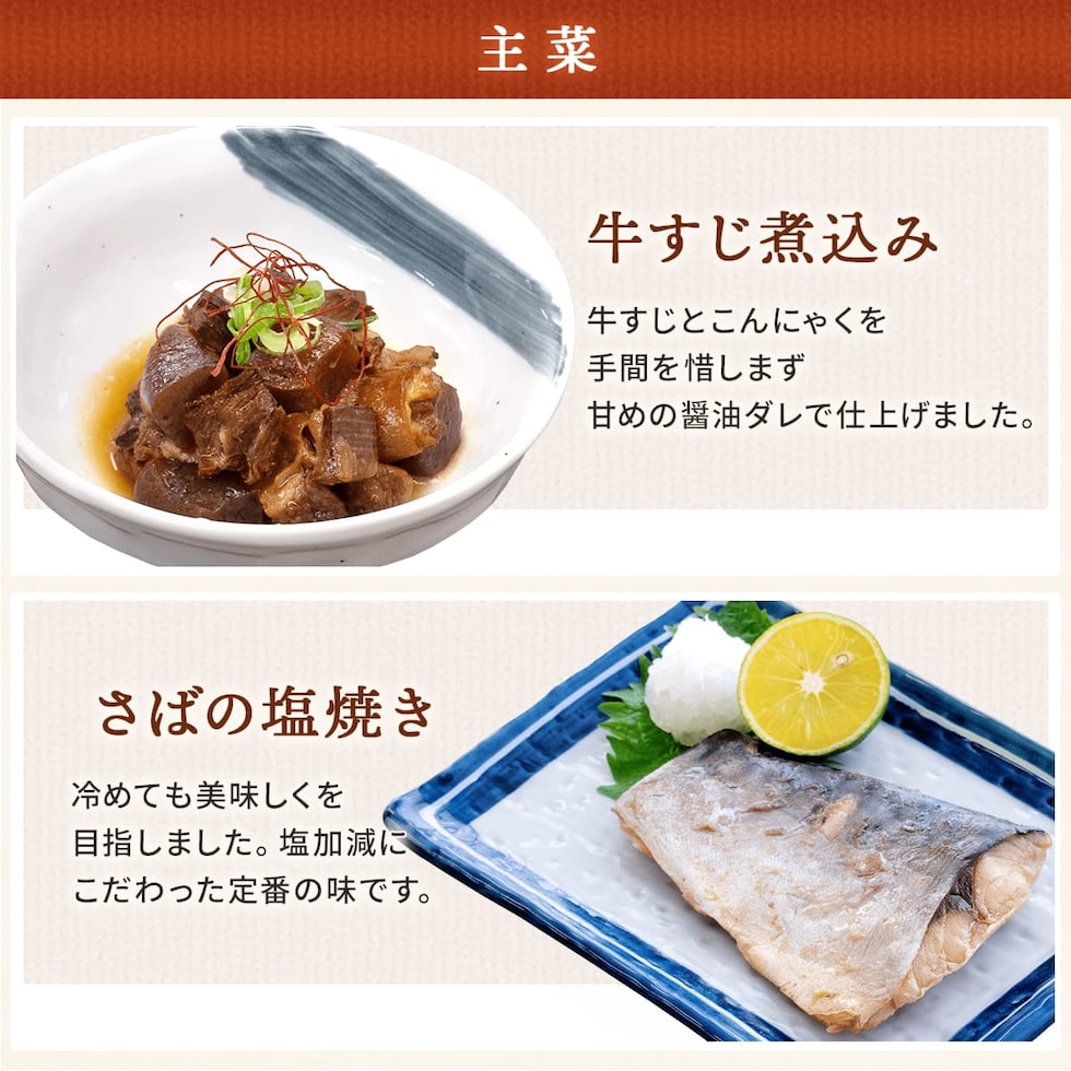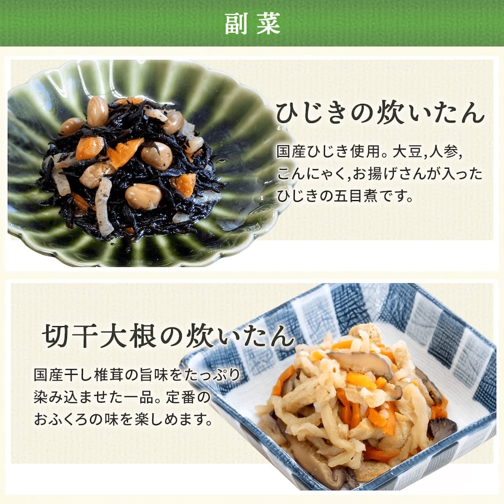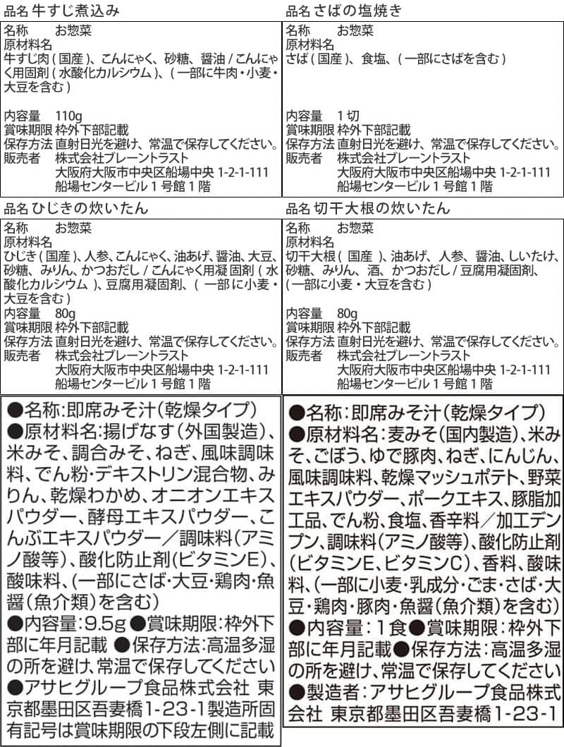 ■ ええおかず 牛すじ煮込み 110g さばの塩焼き 1切 ひじきの炊いたん 80g 切干大根の炊いたん 80g ■ いつものおみそ汁 なす 9.5g とん汁 10.5g 6種 6食 |