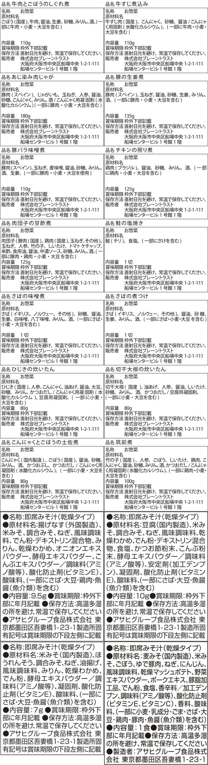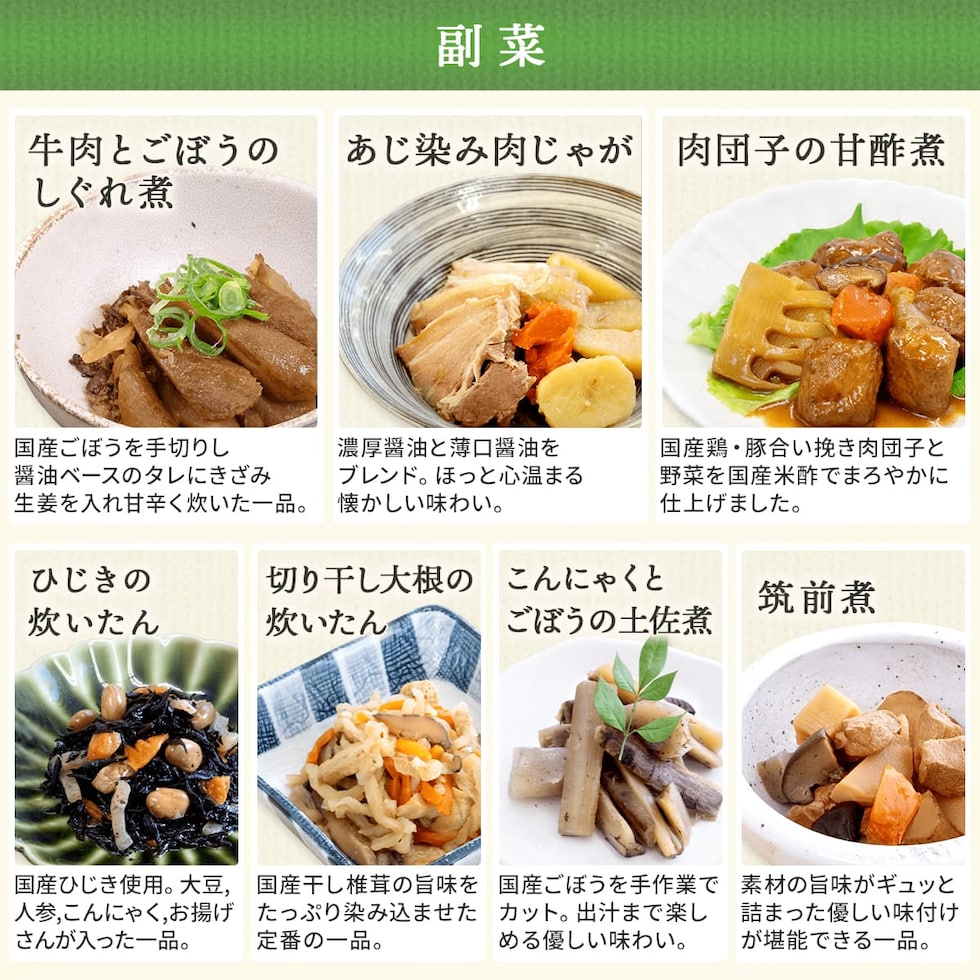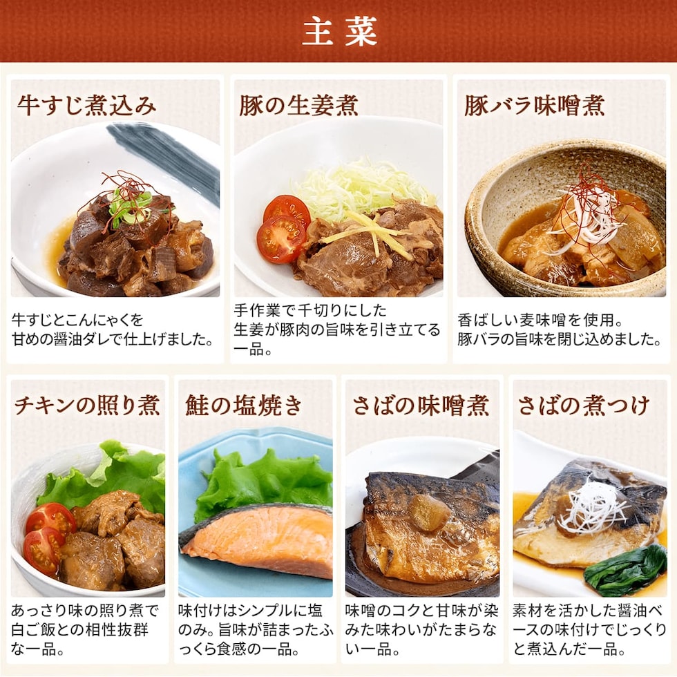 ■ ええおかず 牛肉とごぼうのしぐれ煮 110g 牛すじ煮込み 110g あじ染み肉じゃが 180g 豚の生姜煮 135g 豚バラ味噌煮 110g チキンの照り煮 125g 肉団子の甘酢煮 125g 鮭の塩焼き1切 さばの味噌煮 1切 さばの煮つけ 1切 ひじきの炊いたん 80g 切干大根の炊いたん 80g こんにゃくとごぼうの土佐煮 80g 筑前煮 100g ■ いつものおみそ汁 なす 9.5g とうふ 10g ほうれん草 7g とん汁 10.5g 野菜 10g 里いも 9g なめこ 赤だし 8g 21種 21食 |