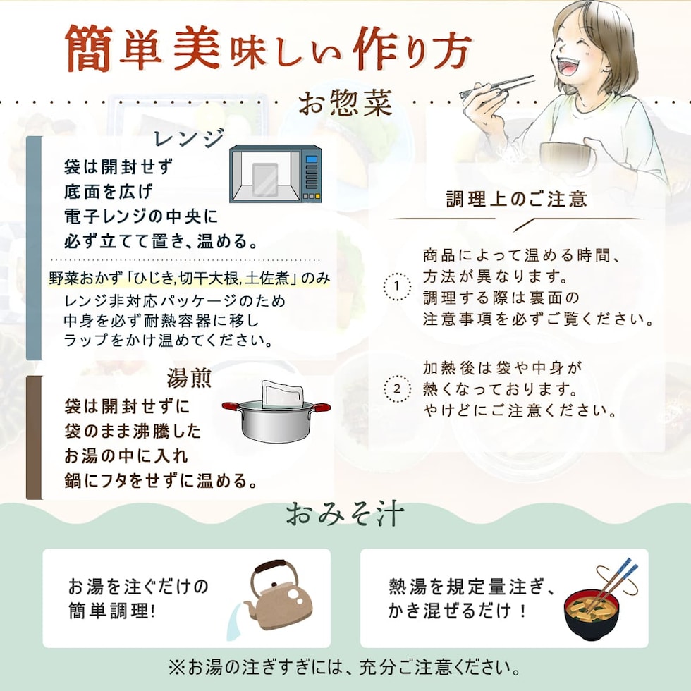 大阪本町嚶鳴 監修 保存料 無添加 ええもん広場 和風 惣菜 ええおかず アマノフーズ いつものおみそ汁 各7食分(1週間分) 詰め合わせ おかずセット 肉 魚 おかず と 野菜 煮物 おかず 、 フリーズドライ味噌汁 を 1食ずつで 主菜 副菜 味噌汁 が バランス よく食べられます。 フリーズドライ味噌汁 は お湯を注いで 軽くかき混ぜるだけ 、 レトルト 惣菜 は そのままでも 食べられて レンジ 対応 パウチ だから 電子レンジ で 温めると より 美味しく 食べられます。 毎日 の 時短 ご飯 や お弁当 の おかず にも おすすめ です。