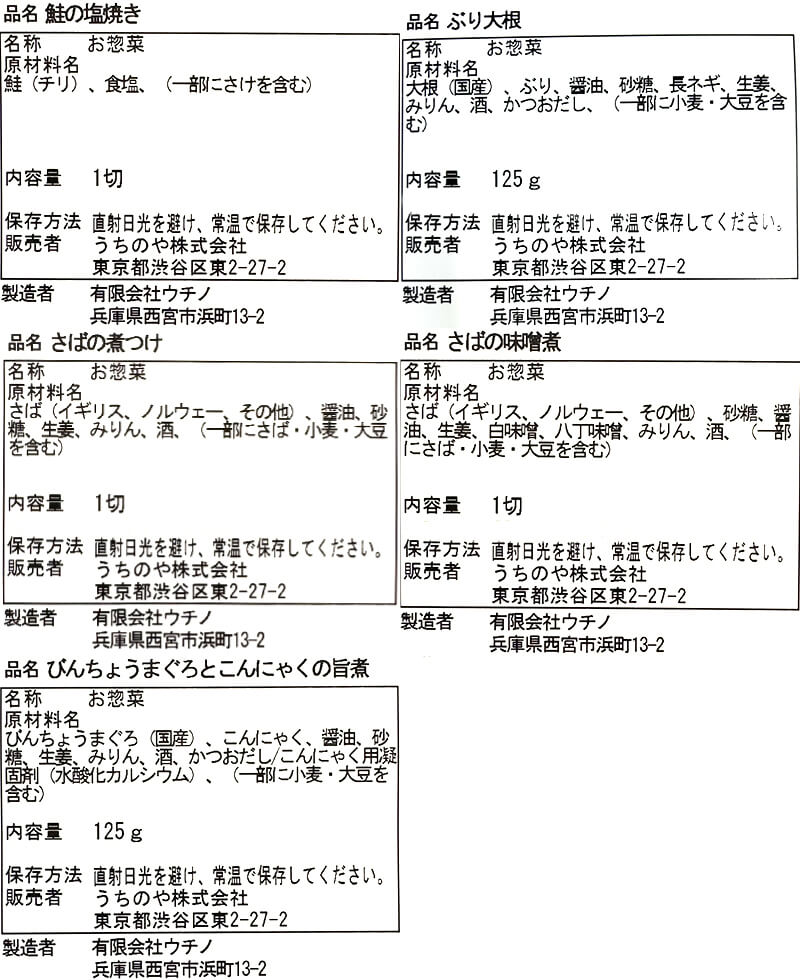 ■ うちのや 鮭の塩焼き 1切 ぶり大根 125g さばの煮つけ 1切 さばの味噌煮 1切 びんちょうまぐろとこんにゃくの旨煮 125g 5種 各4食 合計20食 |