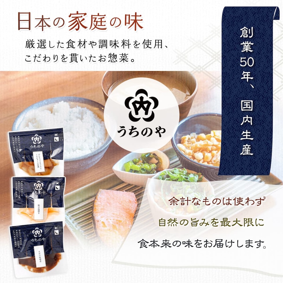 人気 惣菜 の 内野家 uchipac ウチパク シリーズ が「 うちのや 」へとリニューアル! うちのや 魚 惣菜 20食 詰め合わせ おかず セット 鮭の塩焼き さばの煮付け びんちょうまぐろとこんにゃくの旨煮 など 煮魚 焼き魚 惣菜 を 詰め合わせ ました。 毎日 の 食事 や お弁当 の おかず お惣菜 にも 内野家 uchipac ウチパク シリーズ からの リニューアルで 袋のまま レンジ で 温めれる ようになりました。 うちのや は お手軽 簡単 調理 で 時短 ごはん に最適!