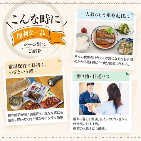 | 常温保存 長期保存 出来て 災害用 防災 食品 や 非常食 保存食 備蓄 食料 常備食 ローリングストック に最適。 アウトドア キャンプ 登山 や 一人暮らし 単身赴任 高齢者 お年寄り 祖父 祖母 両親 子供 への 手土産 食べ物 仕送り に。 毎日の 食事 お弁当 や 朝食 ランチ 夜食 ご飯のお供 にどうぞ。 |
