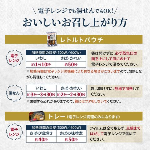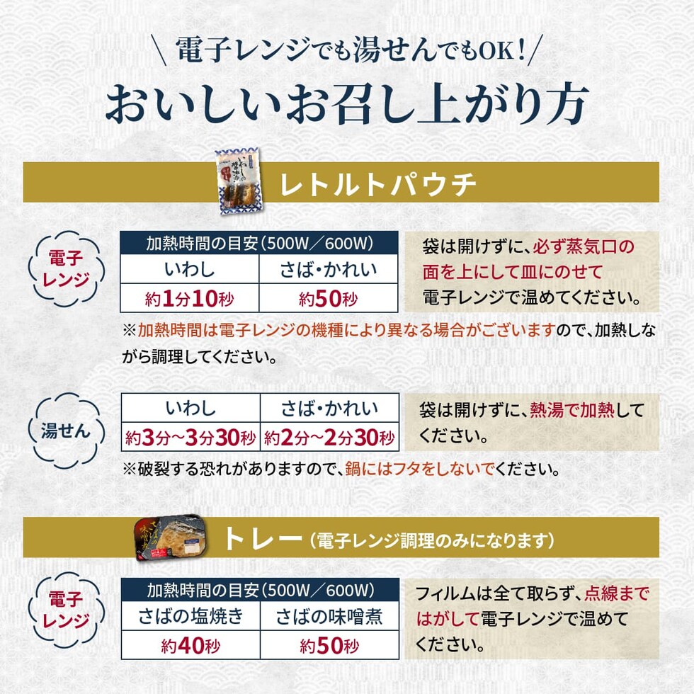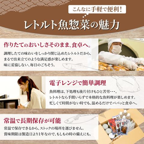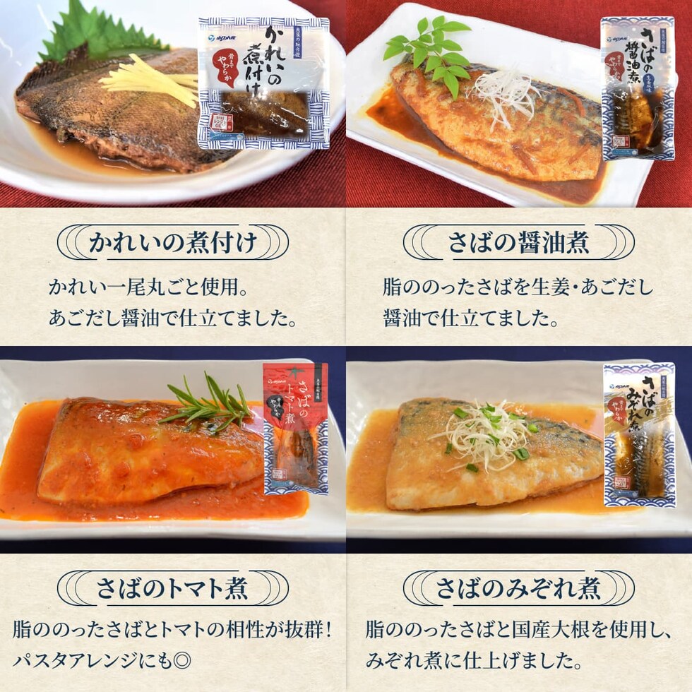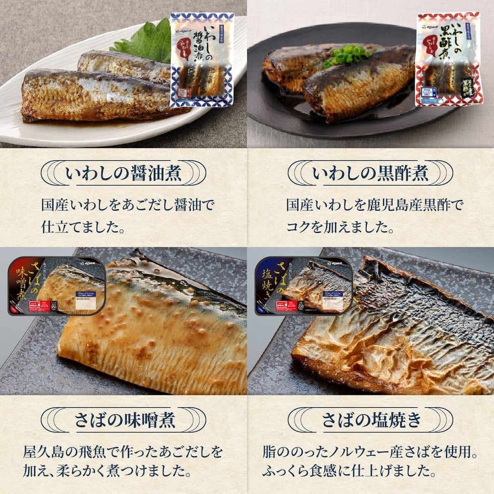 YSフーズ 魚屋が厳選した素材を使用 骨まで食べられる あごだし 仕立ての 脂がのってふっくら 美味しい サバ イワシ カレイ 煮魚 焼き魚 魚惣菜 バラエティ おかずセット レンジ対応 パウチ トレイ なので 容器 袋のまま 温めるだけ で 味噌煮 や 塩焼き 等の 時間と手間のかかる 魚料理 を 手軽 に 美味しく食べられます。 日々の 食事 の おかず ご飯のお供 や 忙しい時の 時短 簡単 ごはん に おすすめ !