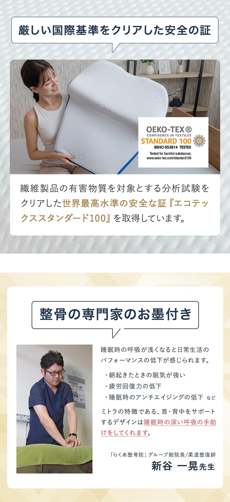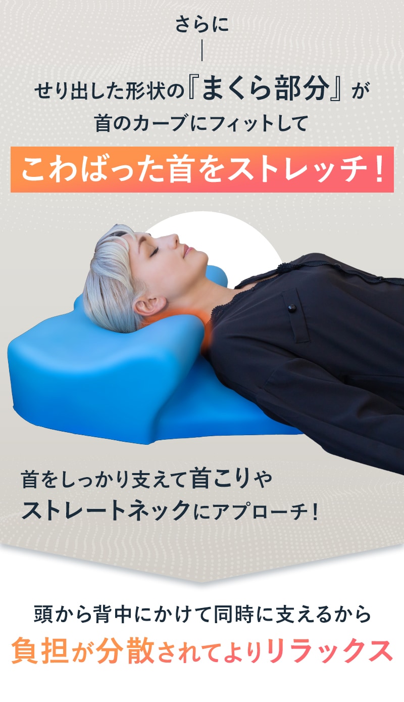 | ■枕とマットを一体化した次世代枕 猫背・巻肩・ストレートネック、気になる姿勢を睡眠中に改善。 首を支えつつ背中を押し上げ鎖骨まわりを伸ばします。 背中のセンター部分を高くし、胸を開いて呼吸を深くすることでいびき防止にも。 日中に収縮した体をストレッチする独特な寝心地。 背中、首、頭を一体化してしっかりサポート。 ■話題の枕 テレビショッピングや有名ブロガーさんに紹介された今注目度急上昇の枕です! ■無重力のような不思議な感触 ジェルとスーパーソフトウレタンを融合したハイブリッドGEL素材『BlueBlood』もちもちとした弾力ある素材で柔軟性と復元力を併せ持ち、首肩を寝ながらリセット。 使う方に合わせてすばやく沈み込む柔軟性と適切な高さで支える復元力があなたの眠りをより良いものにしてくれます。 ■なめらかな手触りのテンセルカバー テンセル使用ふんわりストレッチニットカバー付で滑らかでやわらかく肌への刺激も少ないです。 ■安心・安全 繊維製品の有害物質を対象とする分析試験をクリアした世界最高水準の安全な証『エコテックススタンダード100』を取得した製品です。 |