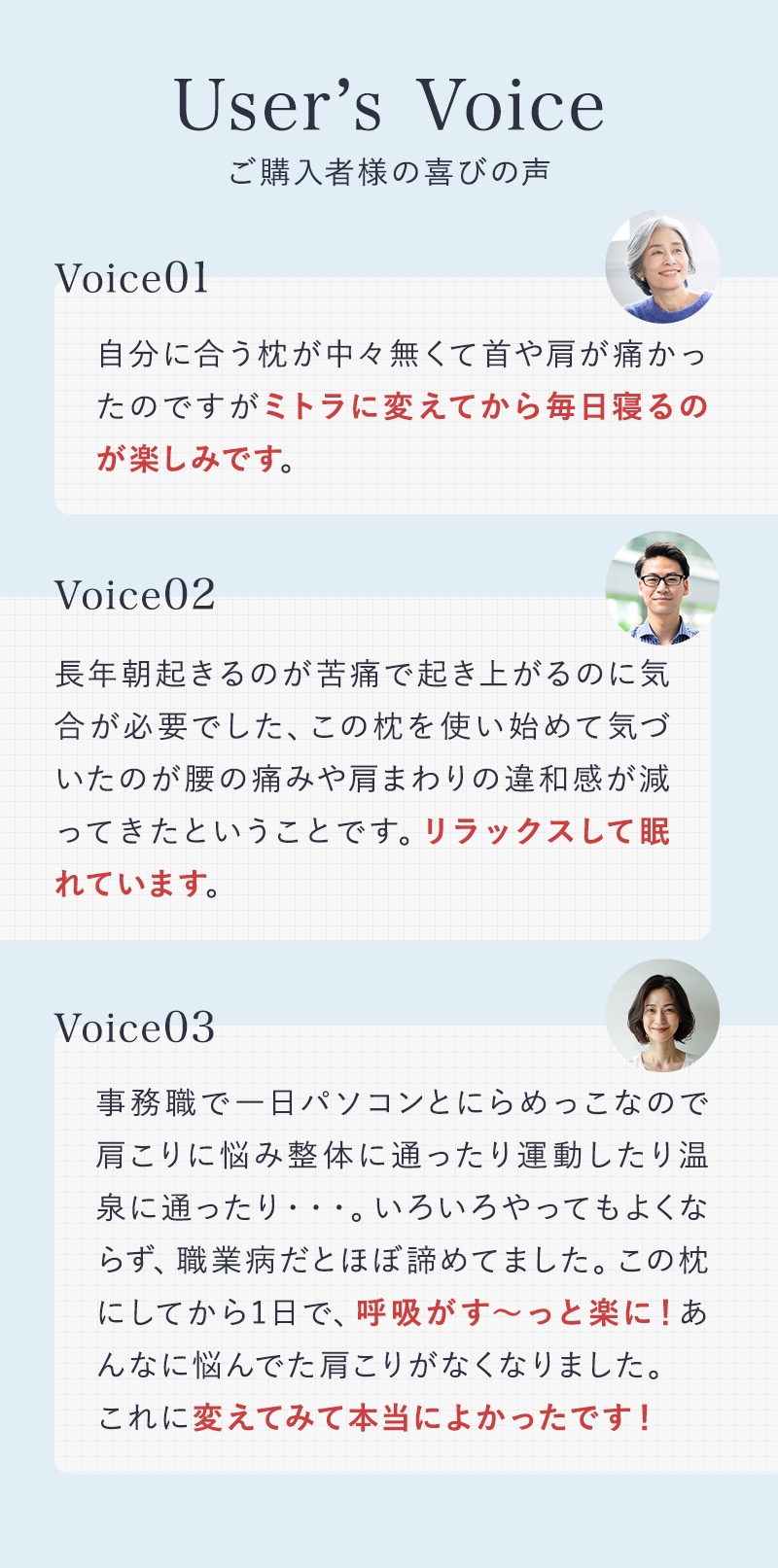 | ≫独特の匂いがありますが、製品不良ではありません ・こちらの製品本体はウレタン素材となっております。独特の匂いがございますが、製品不良ではございません。 ・中材にリラックス効果のあるラベンダーの香料を使用しております。 ≫裏面の窪みについて 発泡性ウレタン素材の特性上、製造過程で枕裏面に小さな窪み及びしこりが出来る場合があります。ご使用上の問題はございません。 ≫枕本体は洗濯しないでください ・枕本体にウレタン素材を使用しており、水を含むと抜けにくい性質がございます。そのためお洗濯してしまうとその後の使用ができなくなる恐れがありますので、お洗濯は絶対にお止めください。 ・枕に装着しているテンセルカバーにつきましては、取り外して洗濯機でお洗濯できます。(ネットをご使用ください) |