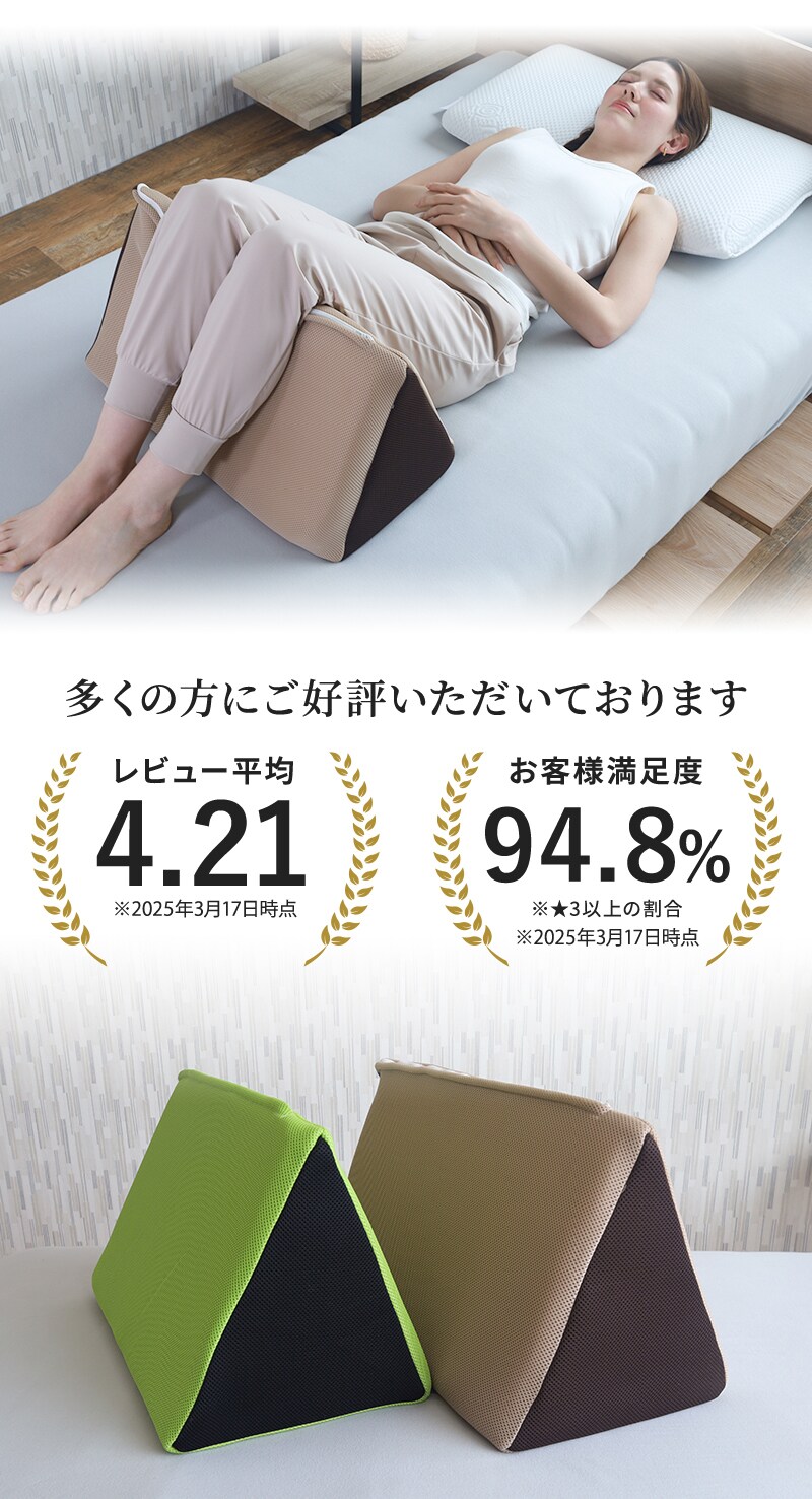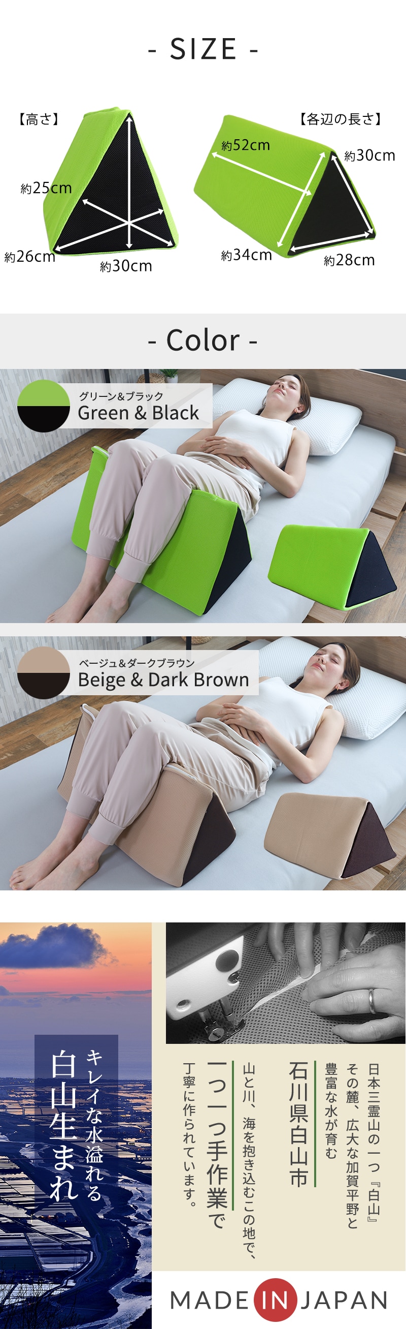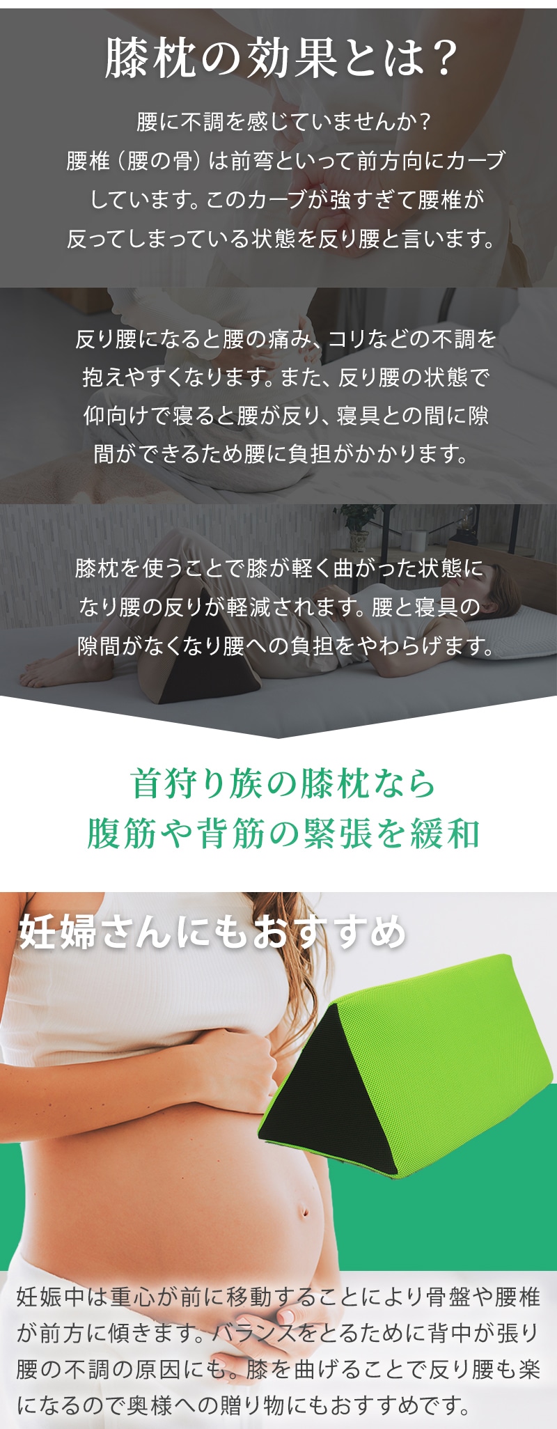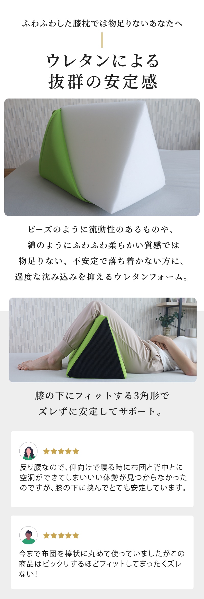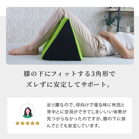 ■反り腰からくる腰の痛みに 反り腰の方は、仰向けで足を伸ばすと寝具と腰の間に隙間ができます。膝を立てて寝ることで隙間をなくし、背中の筋肉をリラックスさせられて腰の負担を軽減。バランスをとる為に背中が張りやすい妊婦さんにもおすすめです。 ■体型に合わせて選べる3Way 3辺全て長さが異なるので体型やお好みに合わせて選べます。腰が楽だと感じる高さでご使用ください。 ■しっかり支えるウレタン製 安定感の良いウレタン製で、沈み込みすぎずに膝裏・太ももをしっかり支え高さをキープします。 ■通気性の良いダブルラッセル生地 メッシュのように通気性が高く、さらにクッション性のあるダブルラッセルを使用しているので、足への負担を軽減します。 ■安心安全の日本製でギフトにもおすすめ 石川県白山市で作られた安心安全の日本製。一つ一つ丁寧に作られています。誕生日や母の日、父の日などご家族やお世話になった方へのプレゼントにも最適です。 |