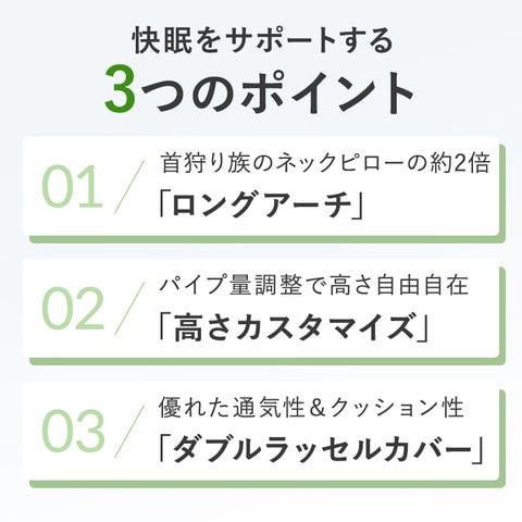 | ■いびき対策に特化! 首狩り族のネックピローの首部分を2倍に広げより首を伸ばしやすい形状に。大きなアーチで首を伸ばすことで気道を確保し呼吸を楽にします。 ■横向き寝が楽 いびき対策に効果的な横向き寝。高めの形状で横向き寝の際も肩に負担がかかりにくく横向き寝が楽! ■高さ調整可能 体型や骨格、お好みによって適切な高さは人それぞれ違うもの。中材のパイプは出し入れすることができ高さ調整が可能。 ■通気性の良いダブルラッセル生地 メッシュのように通気性が高く、さらにクッション性のあるダブルラッセルを使用しているので、熱がこもりにくく蒸れによる気持ち悪さも解消します。 ■安心安全の日本製でギフトにもおすすめ 石川県白山市で作られた安心安全の日本製。一つ一つ丁寧に作られています。誕生日や母の日、父の日などご家族やお世話になった方へのプレゼントにも最適です。 |