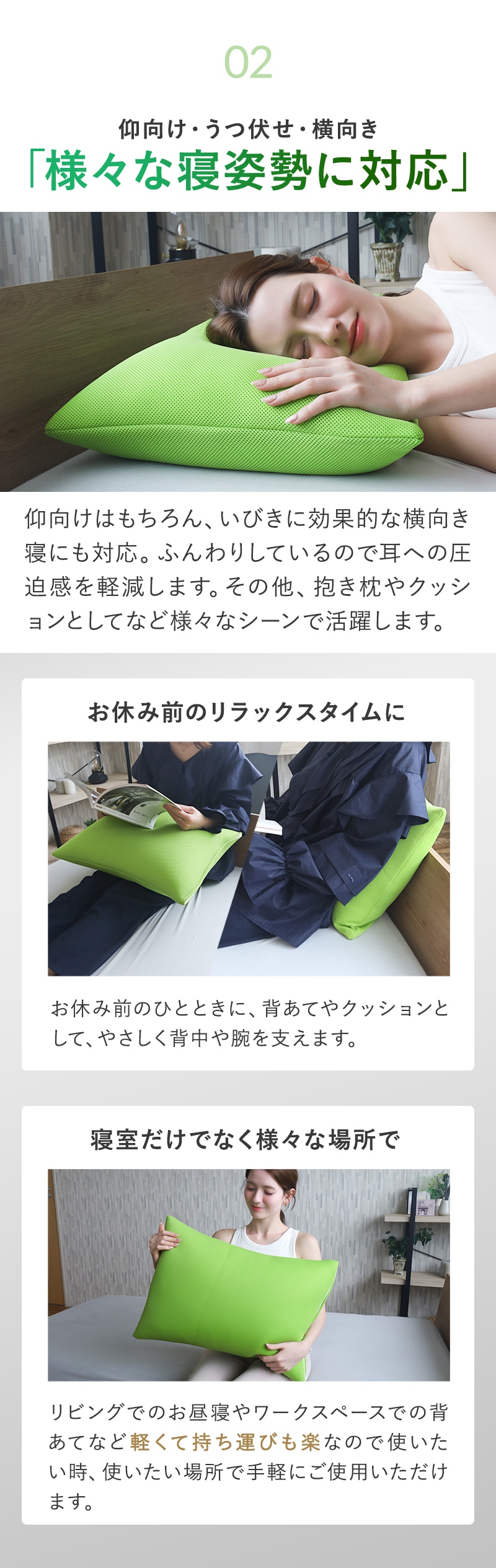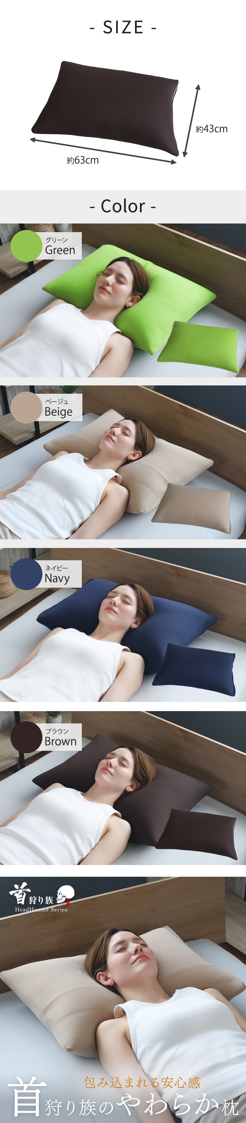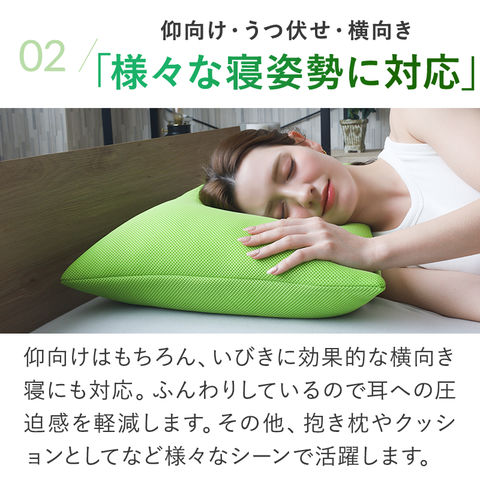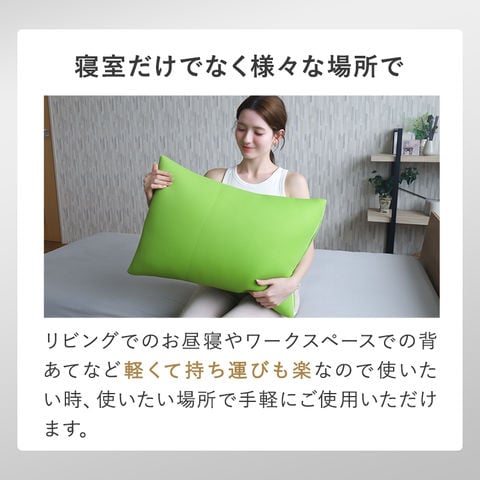 ■ふんわりやわらか低めの寝心地 やわらかな枕は違和感を感じずらく、睡眠を妨げません。高めでボリュームのある見た目に反し低めの寝心地で首にやさしく全身リラックスしてお休みいただけます。 ■様々な寝姿勢に対応 仰向けはもちろん、うつ伏せや横向きでも圧迫感なくお休みいただけます。その他、抱き枕やクッションとしてもご使用いただけ様々なシーンで活躍します。 ■軽くて持ち運びも楽 リビングでのお昼寝やワークスースでの背あてなど軽くて持ち運びも楽なので使いたい時、使いたい場所で手軽にご使用いただけます。 ■通気性の良いダブルラッセル生地 生地には通気性が高く、クッション性があるダブルラッセルを使用。熱がこもりにくく蒸れによる気持ち悪さも解消します。 ■安心安全の日本製、カバーは洗濯可能でいつでも清潔 石川県白山市で作られた安心安全の日本製。一つ一つ丁寧に作られています。カバーはご自宅で洗濯できるので、衛生的にも安心。いつでも清潔にお使いいただけます。 ■ギフトにもおすすめ ご家族やお世話になった方へ。誕生日や母の日、父の日などプレゼントにも最適です。 |