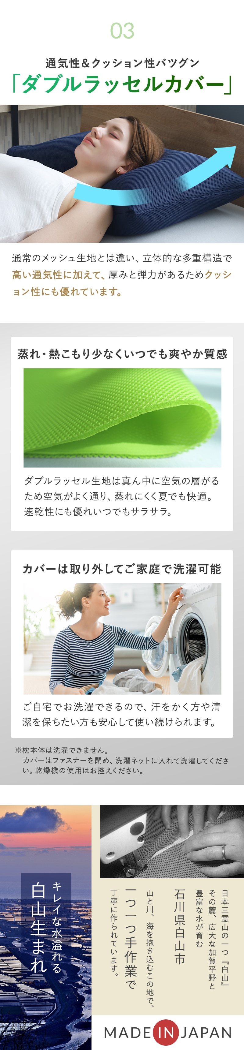 | お洗濯 | カバーは洗濯可能。ファスナーを閉め洗濯ネットに入れて洗濯してください。乾燥機のご使用はお控えください。 ※枕本体は洗濯不可。 | |