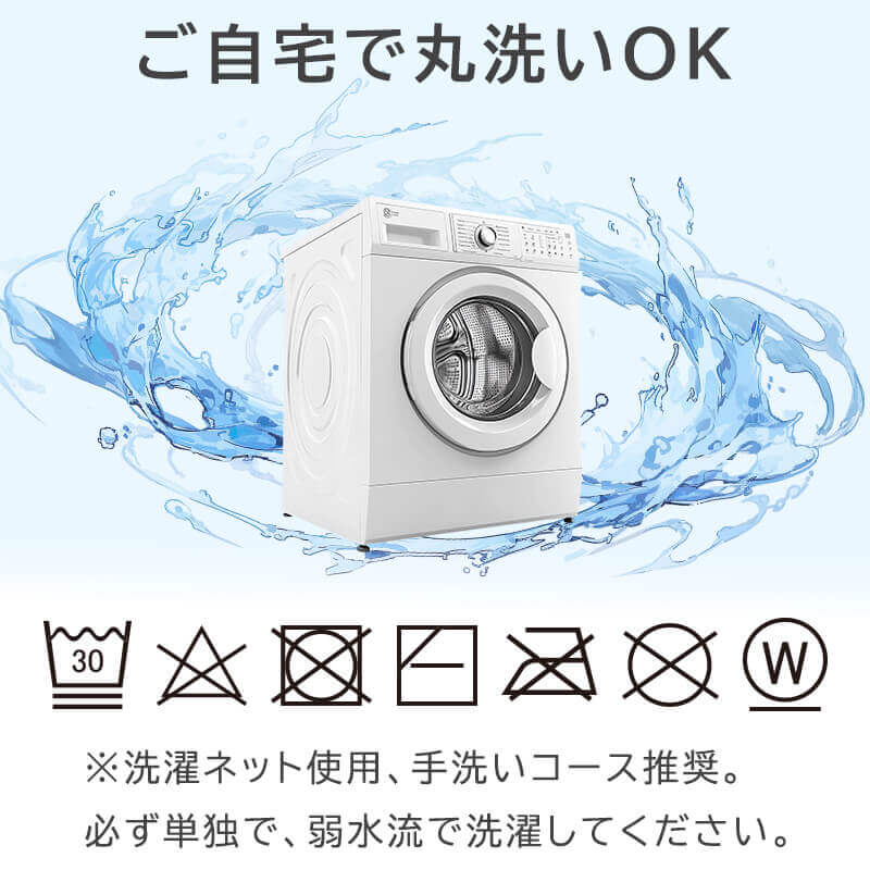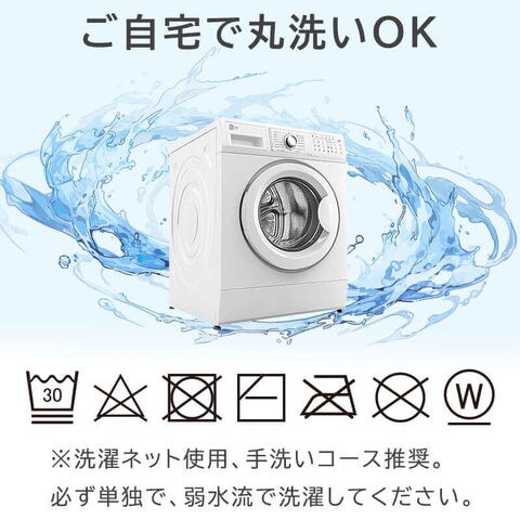 | お洗濯 | 家庭で洗濯可能。 ※洗濯ネット使用、手洗いコース推奨。必ず単独で、弱水流で洗ってください。ファスナーを閉じて洗濯してください。 |