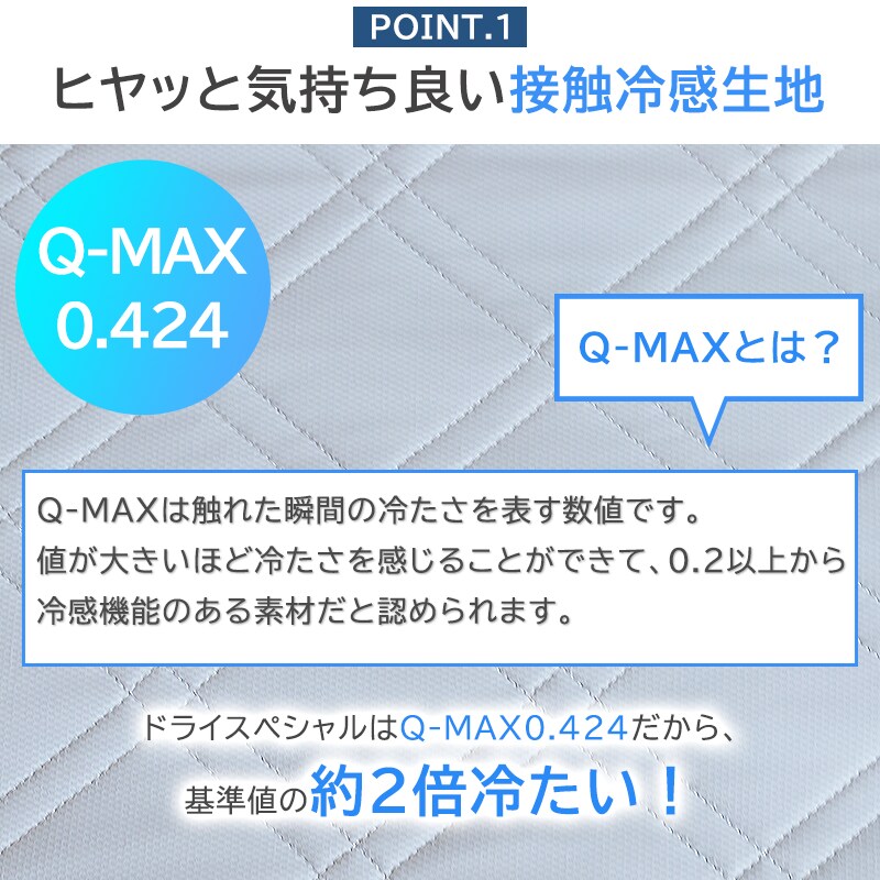 | 素 材 | 表地:ナイロン70%、ポリエチレン30%(Q=MAX0.424強冷感タイプ) 裏地:ポリエステル100%(140g/m2 メッシュ仕様 中わた:ポリエステル100%(吸湿ドライシート+抗菌防臭・防ダニわた) |