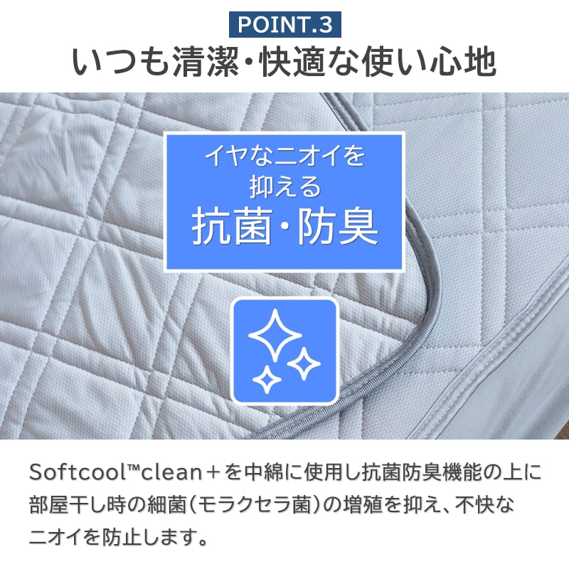 | ■ひんやり冷感敷きパッド 汗ばむ季節にうれしい、Q-MAX0.424の強冷感タイプの敷きパッドです。 ■湿気を吸収して放湿する吸湿ドライシート内蔵 内部のドライシートが 寝汗を素早く吸収して放湿してサラッとした使用感。裏側はメッシュ仕様で通気性抜群なので、湿気や熱がこもりにくいです。 ■抗菌防臭中わた 抗菌防臭・防ダニ機能のある中わた入りで、より清潔にお使いいただけます。 |