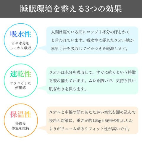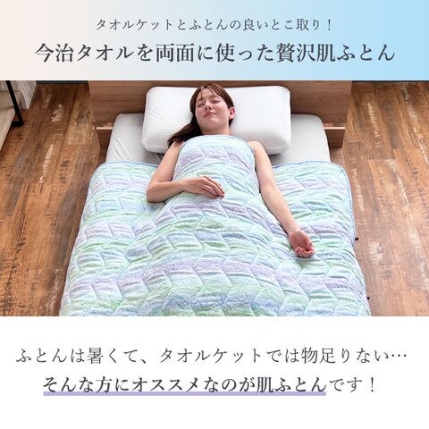 | ■タオル地の肌ふとん 表面がタオル地になっていて、サラッとした使用感のふとんです。寝冷えやエアコン冷えを防ぎます。 ■imabari towelブランドのタオル タオルの聖地、今治でつくられた「今治タオル」。今治タオル工業組合による独自の品質基準をクリアしたタオルのみが、安心安全の証である「imabari towel」ブランドを掲げることができるのです。 ■吸水・速乾と保温性 タオル地は綿100%素材なので、吸水性と速乾性が高く蒸れにくいです。充填された中綿が体温を適切に保ち、快適な睡眠環境を生み出します。 |