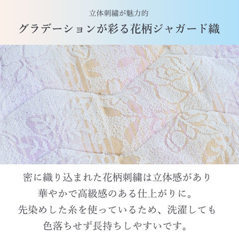 | 特徴 | タオルケット ふとん 布団 肌掛け シングル 吸水性 保温 ふんわり ふわふわ さらさら 夏 オールシーズン おしゃれ ジャガード ジャカート 花柄 柄 ブルー ピンク リバーシブル 両面 パイル 綿 コットン100% よく眠れる 洗濯 洗濯可能 洗濯できる ウォッシャブル ウォッシュ 洗える インナー 薄手 軽い 刺繍 デザイン 爽やか 明るい 清潔 日本製 今治 今治タオル imabari towel タオル メイドインジャパン Made In Japan MadeInJapan |
