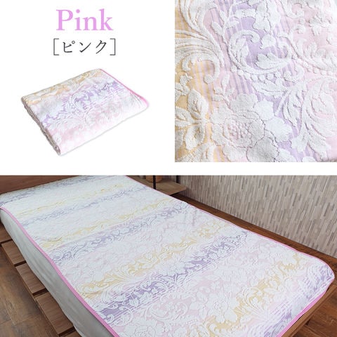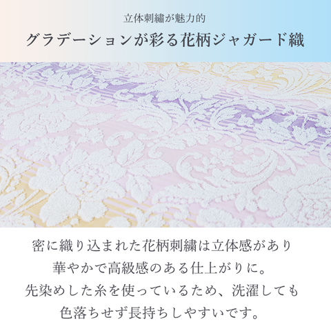 ■タオル地の敷きパッド タオル地のサラッとした使用感の敷きパッドです。花柄の刺繍とグラデーションがお部屋に彩りを生み出します。 ■imabari towelブランドのタオル タオルの聖地、今治でつくられた「今治タオル」。今治タオル工業組合による独自の品質基準をクリアしたタオルのみが、安心安全の証である「imabari towel」ブランドを掲げることができるのです。 ■吸水・速乾と保温性 タオル地は綿100%素材なので、吸水性と速乾性が高く蒸れにくいです。 | ||