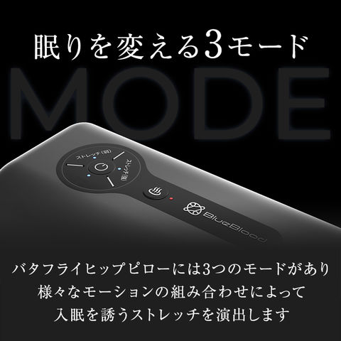 | ■お休み前の新習慣 寝ながら骨盤ストレッチ!骨盤ケアのヒップピローBlueBloodバタフライヒップピロー 「寝床でのストレッチや軽運動」が睡眠に良い環境を与える点から、睡眠環境・寝具指導士が動的寝具の開発に取り組み、完成した次世代「お尻枕」 ■選べる3モード お尻を片方ずつ押し上げて骨盤を左右にひねるストレッチモードの弱・強、お尻を押し上げ骨盤まわりをストレッチするリフレッシュモードの3モード搭載。(各モード約15分) 各モードは自動終了し、その後フラットな状態に戻るので、面倒な後片付け要らず。敷きっぱなしでOK!ストレッチ後はそのままお休みいただけます。 ■温熱機能付き さらに温熱機能付きで冬はポカポカ気持ちいい♪(※不要な場合は手動でOFFに出来ます) ■ギフトにもぴったり 化粧箱入りでギフトにもオススメです。 |