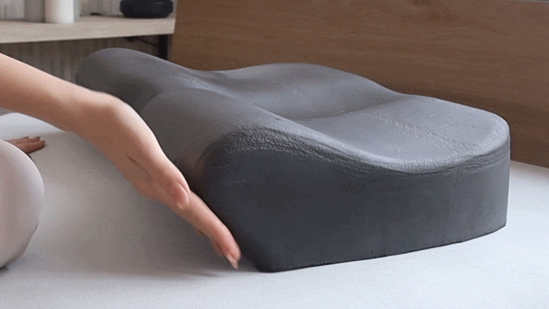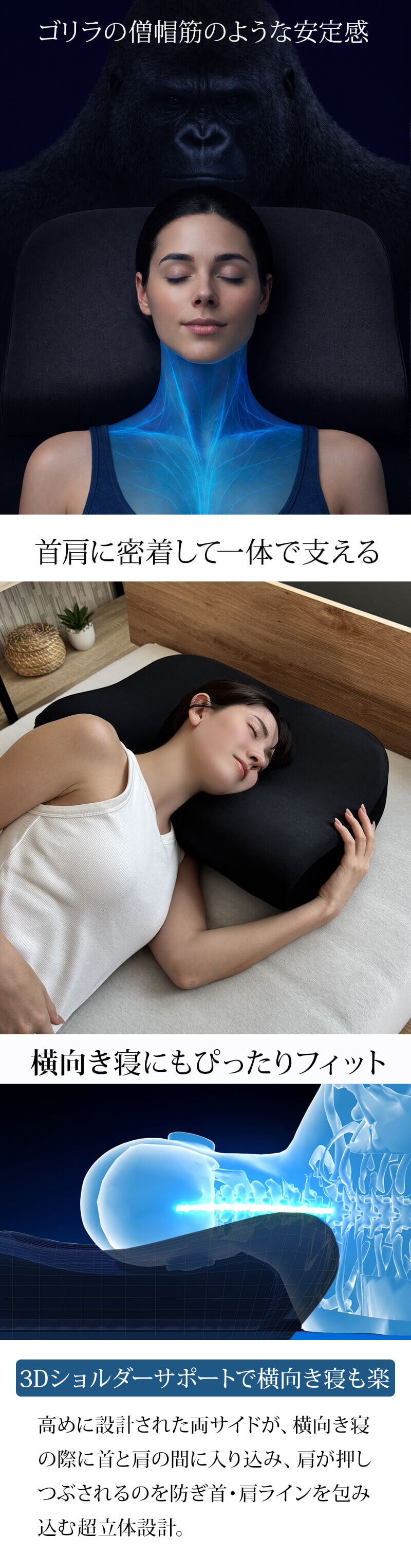 肩が押しつぶされるのを防ぐ立体設計と復元力のある素材で眠りをサポート。