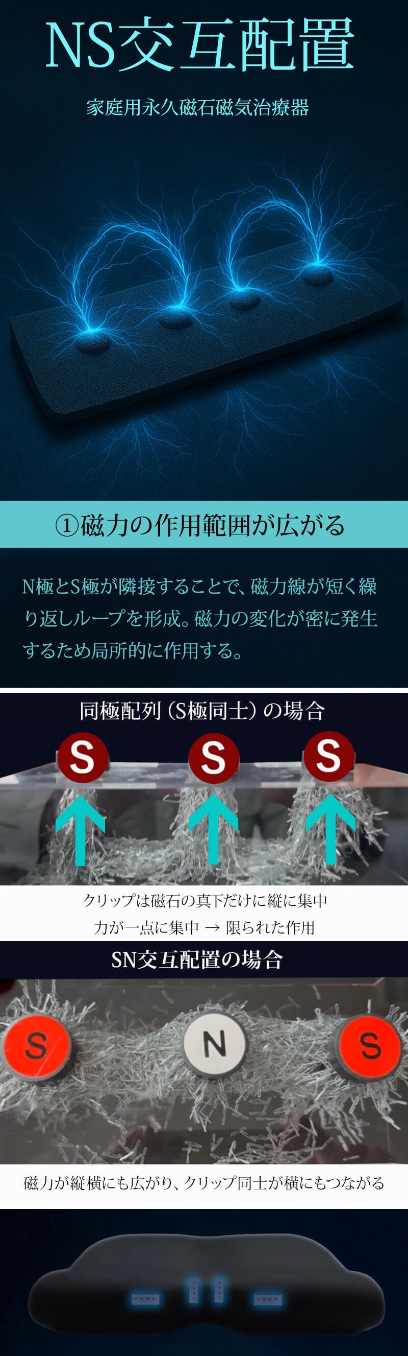 130ミリテスラの磁石を4個搭載したシートを4枚組み合わせ首肩周りのラインに沿って配置。寝ている間に磁気がコリにアプローチ。