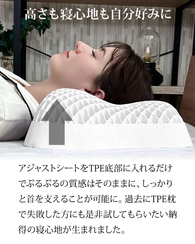 ■新素材TPEによる無重力体験 ぷるぷるとした弾力のある新素材「TPE」と網目構造が、頭の重さを瞬時に分散。優れた体圧分散性により、まるで宙に浮いているような心地よいフィット感を実現します。 ■首を支える超立体構造 頸椎のカーブに自然に沿う3D立体構造で、理想的な寝姿勢をしっかりサポート。付属のシートで自分好みの高さに微調整できるため、仰向けでも横向きでも快適に眠れます。 ■丸洗いできる圧倒的な清潔さ 格子状のオープン構造が熱や湿気を効率よく逃がし、睡眠中の蒸れを解消。枕本体をシャワーで直接丸洗いできるため、汗やニオイ、ダニを気にせず常に清潔を保てます。 |