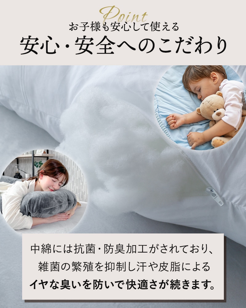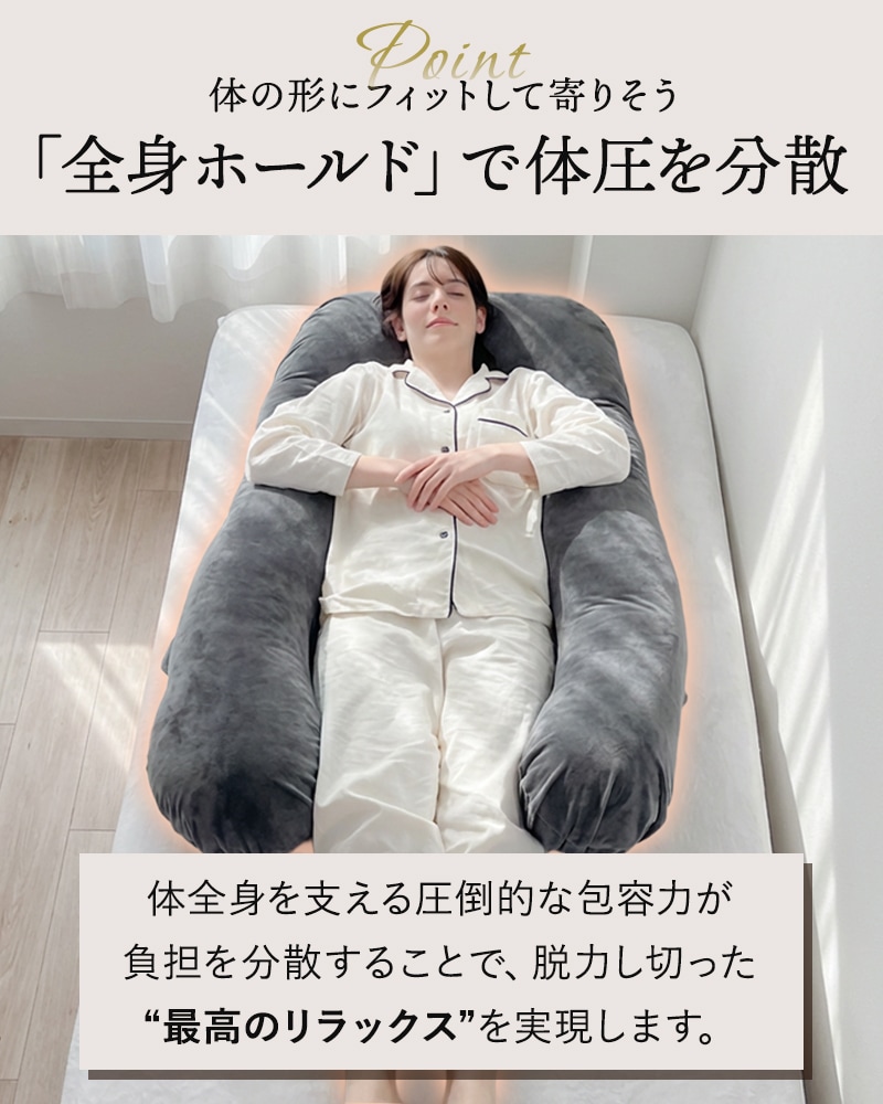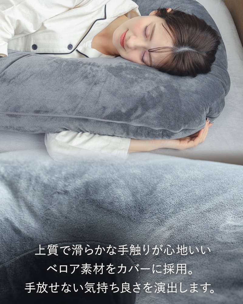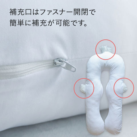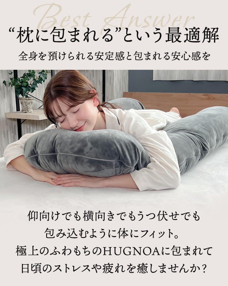 ■全身がとろける、無重力の解放感 左右の大きなクッションが、全身を優しくホールド。背中に支えがあるHUGNOA(ハグノア)だからこそできる仰向け、横向き、そして「斜め向き寝」まで、あらゆる姿勢で極上の癒やしを提供します。 ■「無段階」で叶える、あなただけのオーダーメイドな高さ調整。 サイドファスナーから中綿を自由に出し入れできる設計を採用。1cm単位でボリュームをコントロールできるため、体型や好みに合わせた「自分だけの正解」が作れます。既製品の枕では満足できなかった「枕難民」の方にこそ試してほしい、究極のカスタマイズ性です。 ■24時間、あなたの相棒に。寝室からリビングまで広がる心地よさ。 就寝時の快眠サポートはもちろん、ソファでの読書やスマホ操作の背もたれ、産後の授乳クッションとしても大活躍。大きく開くワイドファスナー設計でカバーの着脱も簡単。毎日使うものだからこそ、使いやすさと安全性に徹底的にこだわりました。 | ||