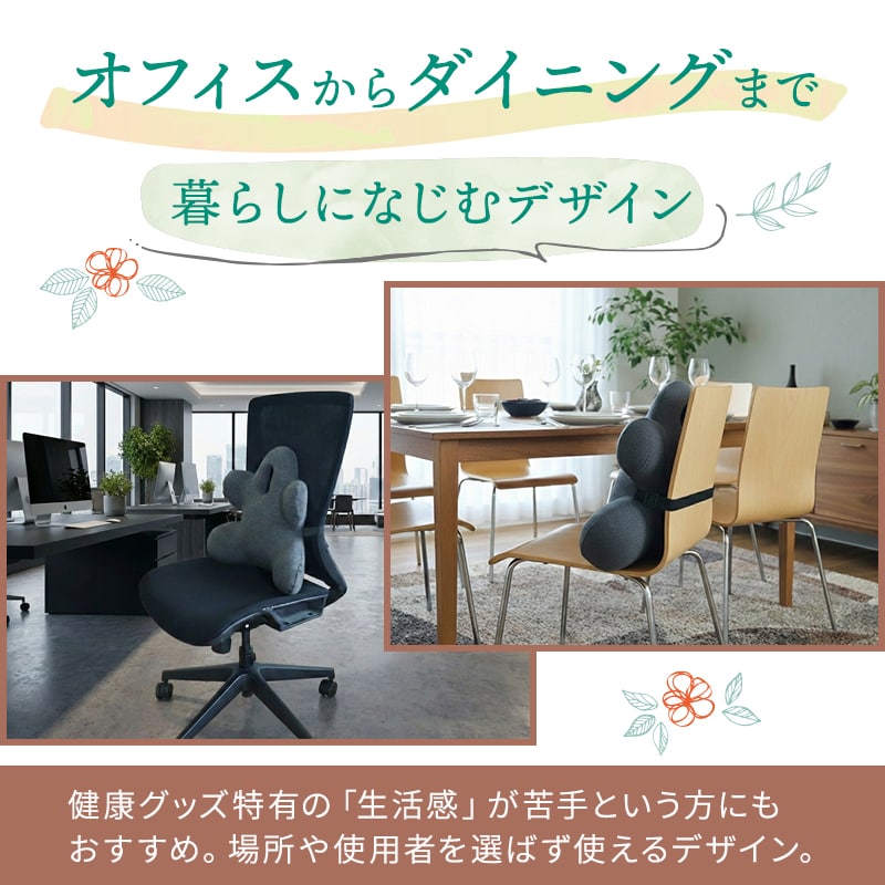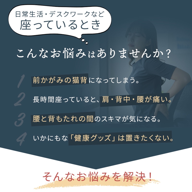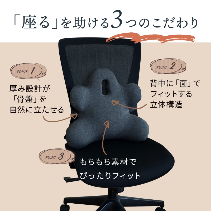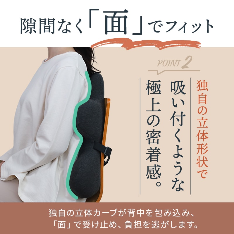■骨盤を支える絶妙な厚み設計 理想的な厚みで骨盤が立ち、自然に美姿勢をキープ。 ■背中に「面」でフィットする立体構造 独自の立体カーブが背中を覆い、「面」で受け止め負担を軽減。 ■もちもち素材で疲れにくい もちもち素材でフィットし、長時間座っても崩れず安定。 ■暮らしになじむデザイン インテリアに馴染むおしゃれなデザイン。健康グッズ特有の「生活感」が苦手な方にもおすすめ。 ■調整可能なゴムベルト付き 長さを調整できるゴムベルト付きなので、どんな椅子にも固定できズレを防止。 | ||