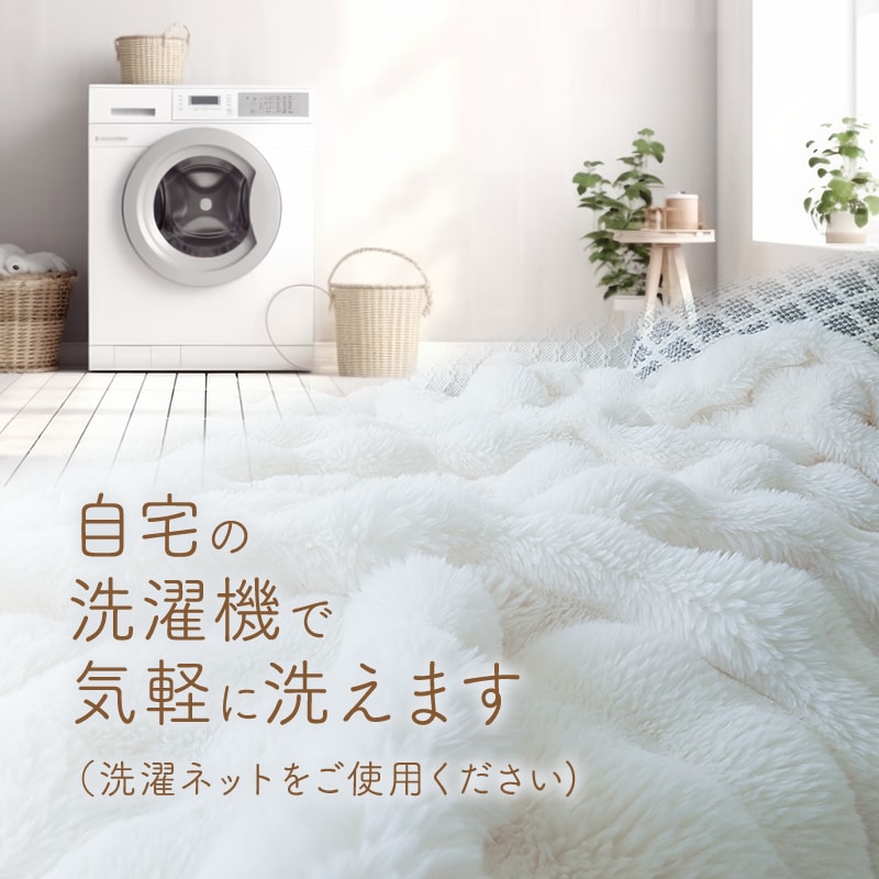 ■身体が甘く溶けだす、2枚合わせが叶える極上のふわとろ体験 うさぎのような3cmのふわふわファーと、しっとりなめらかなフランネル。この2つを贅沢に重ねることで、今までにないとろける肌ざわりを叶えました。もこもこの立体カットが作る可愛い見た目と上品なツヤで、お部屋にいる時間がもっと幸せになります。表も裏も、触れるたびに心がほどける至福の心地よさです。 ■圧倒的なボリュームで、暖かさを逃さない 手が沈み込むほどのボリューム感で、冷えた身体を優しく包み込みます。温まった空気をしっかりキープして、朝までずっとポカポカ。毛が抜けにくい工夫もされているので、「ふわふわ感」が長く続くのもうれしいポイントです。 ■毎日使うものだから、お手入れまで心地よく 冬のイヤなパチパチを抑える「静電気防止加工」で、乾燥する季節もストレスフリー。さらに、ご家庭の洗濯機で丸洗いできるので、いつでも清潔に「ふわふわ」を楽しめます。おしゃれなデザインと使いやすさを両立した、一日の終わりの自分を甘やかす最高のパートナーです。 |