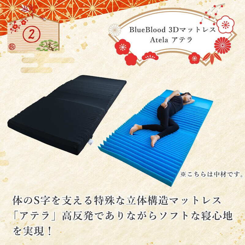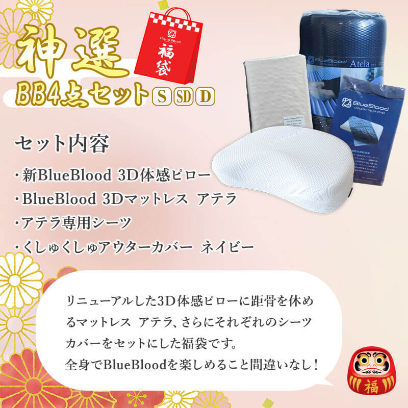 福袋 2024 神選BBセット ダブル マットレス + 枕 全身ケアで距骨を休める足楽 マットレス に リニューアル した BlueBlood 3D体感ピロー 、さらにそれぞれのシーツ・カバーをセットにした お得 な 福袋