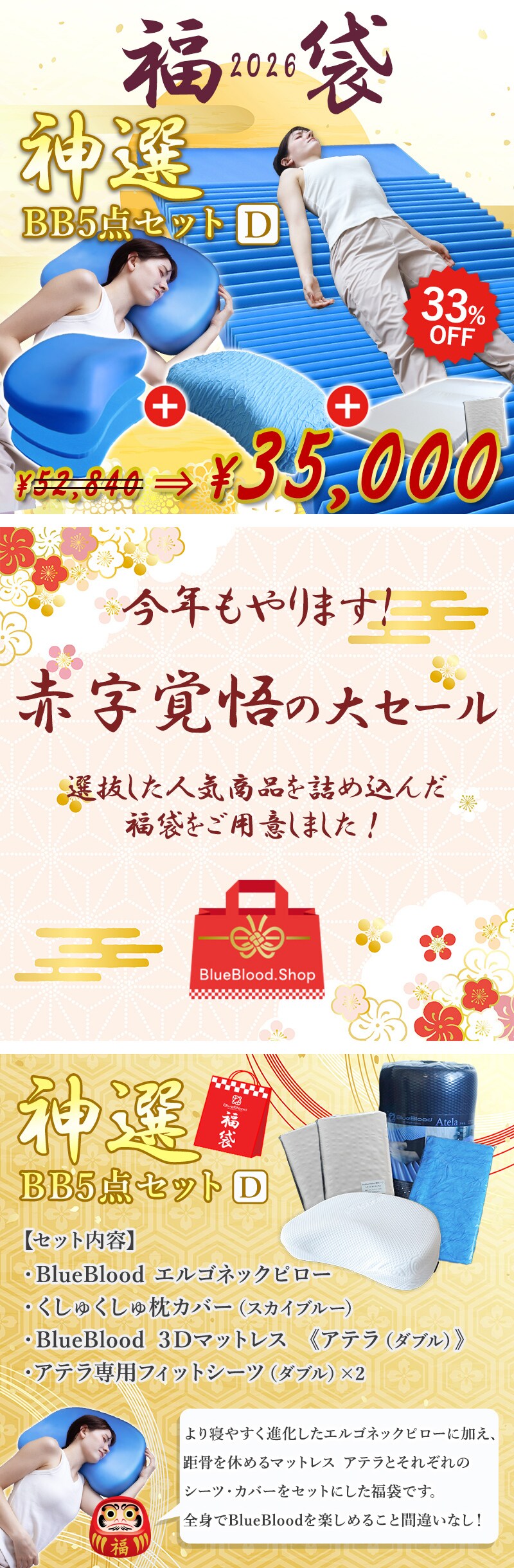 【福袋2026】 神選BBセット ダブル 全身ケアで距骨を休める足楽マットレス アテラ (ダブル) にBlueBloodエルゴネックピロー、さらにそれぞれのシーツ・カバーをセットにした お得 な 福袋
