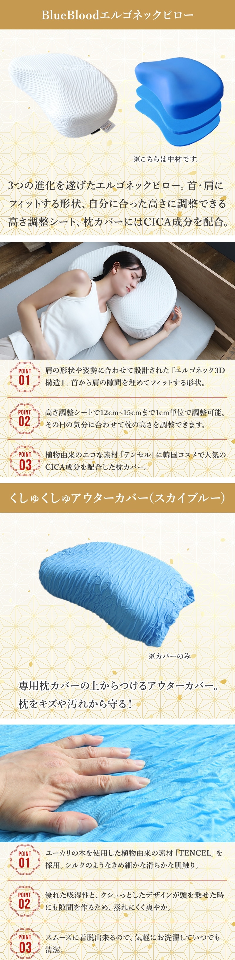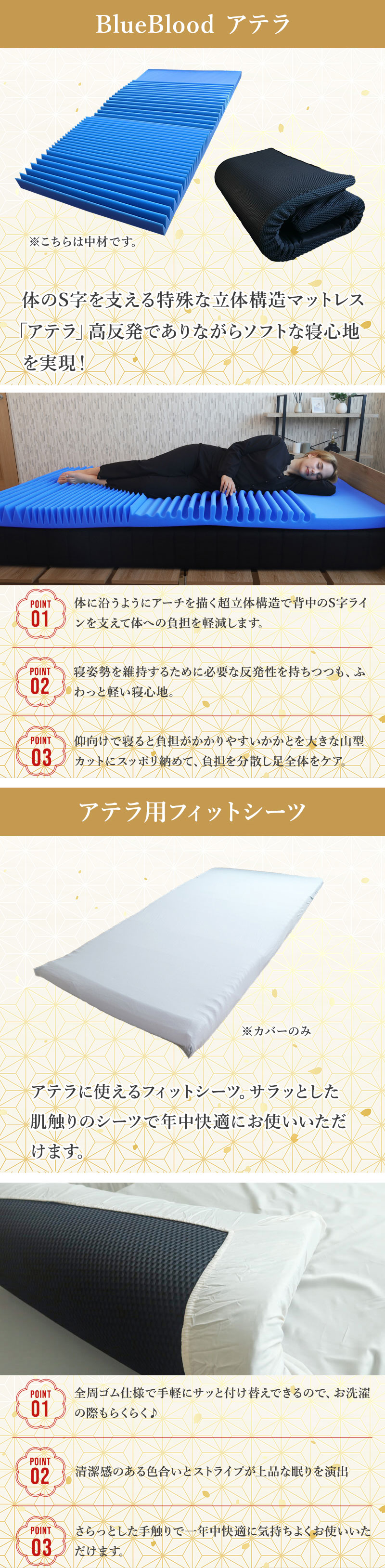 | セット内容 | ・BlueBoodエルゴネックピロー×1 ・くしゅくしゅアウターカバー(スカイブルー)×1 ・BlueBlood超立体高反発マットレス アテラ×1 ・アテラ用フィットシーツ×2 | |
