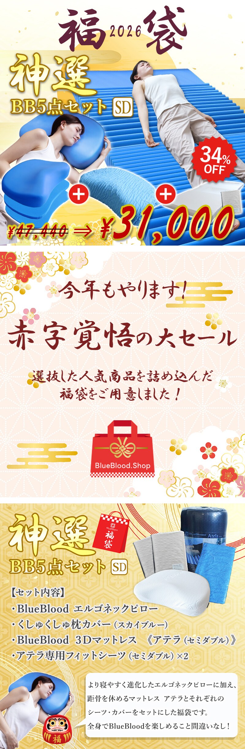 【福袋2026】 神選BBセット セミダブル 全身ケアで距骨を休める足楽マットレス アテラ (セミダブル) にたBlueBloodエルゴネックピロー、さらにそれぞれのシーツ・カバーをセットにした お得 な 福袋