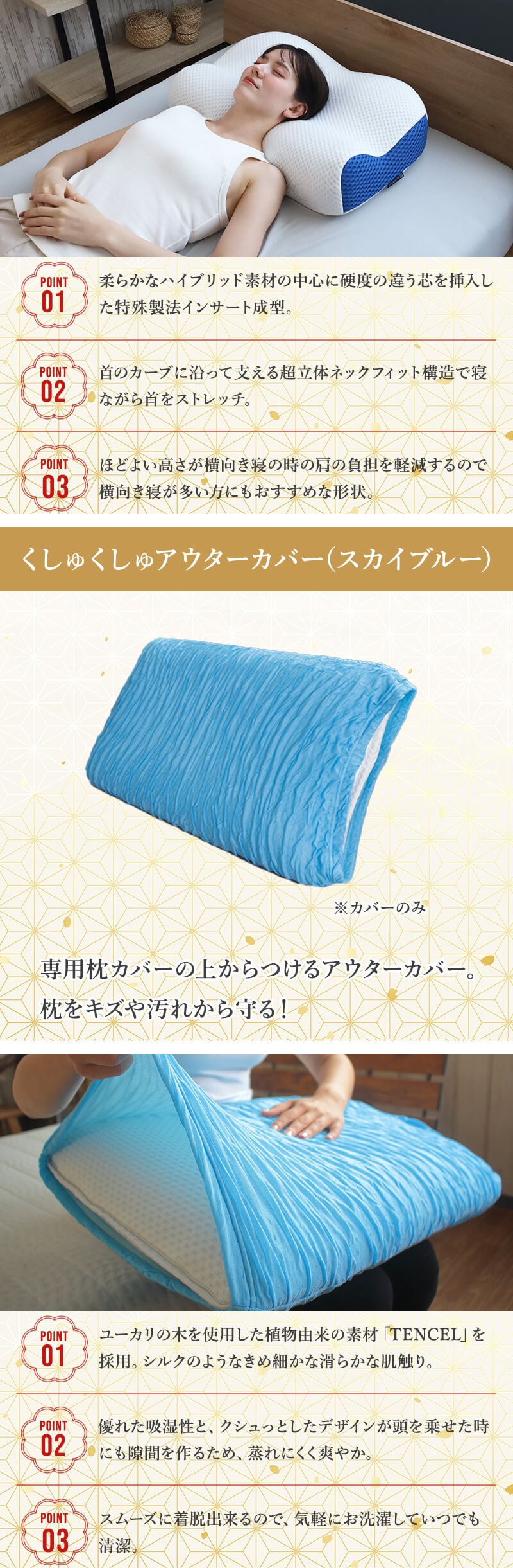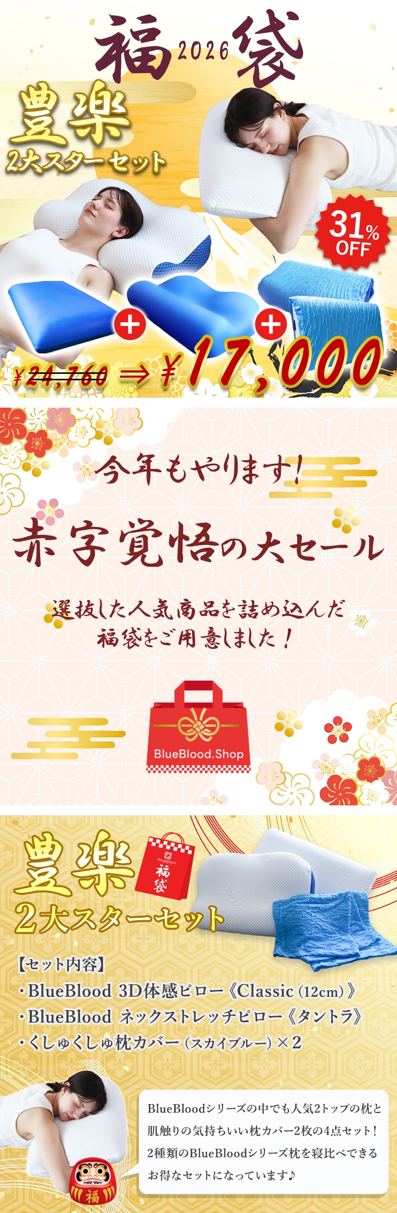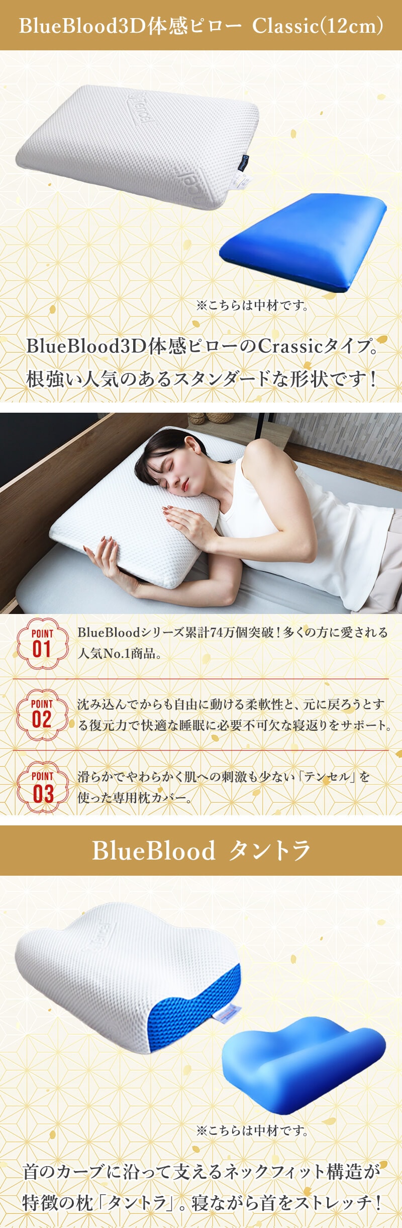 ※詳細については各商品ページをご確認ください。 ※BlueBlood3D体感ピローclassicは12cmに限ります。高さ変更は出来ません。 ※くしゅくしゅ枕カバーのお色はスカイブルーに限ります。変更は出来ません。 ※使用感や自分に合わないなどのイメージ違い、サイズ交換カラー交換などのお客様都合による返品や交換はお受けすることができません。予めご了承ください。 | |