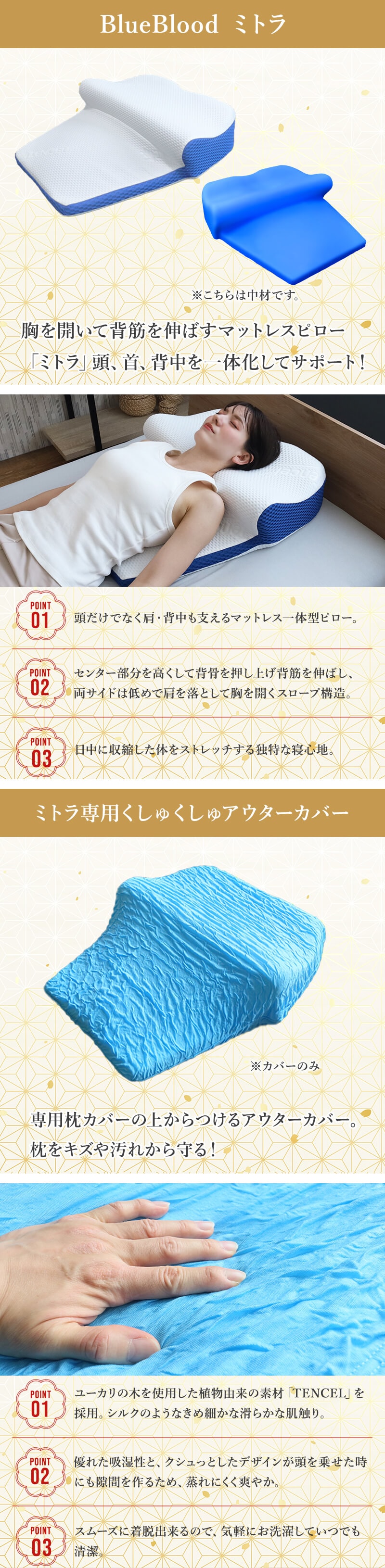 ・BlueBloodマットレスピロー ミトラ×1 ・ミトラ専用くしゅくしゅ枕カバー(スカイブルー)×2 | |