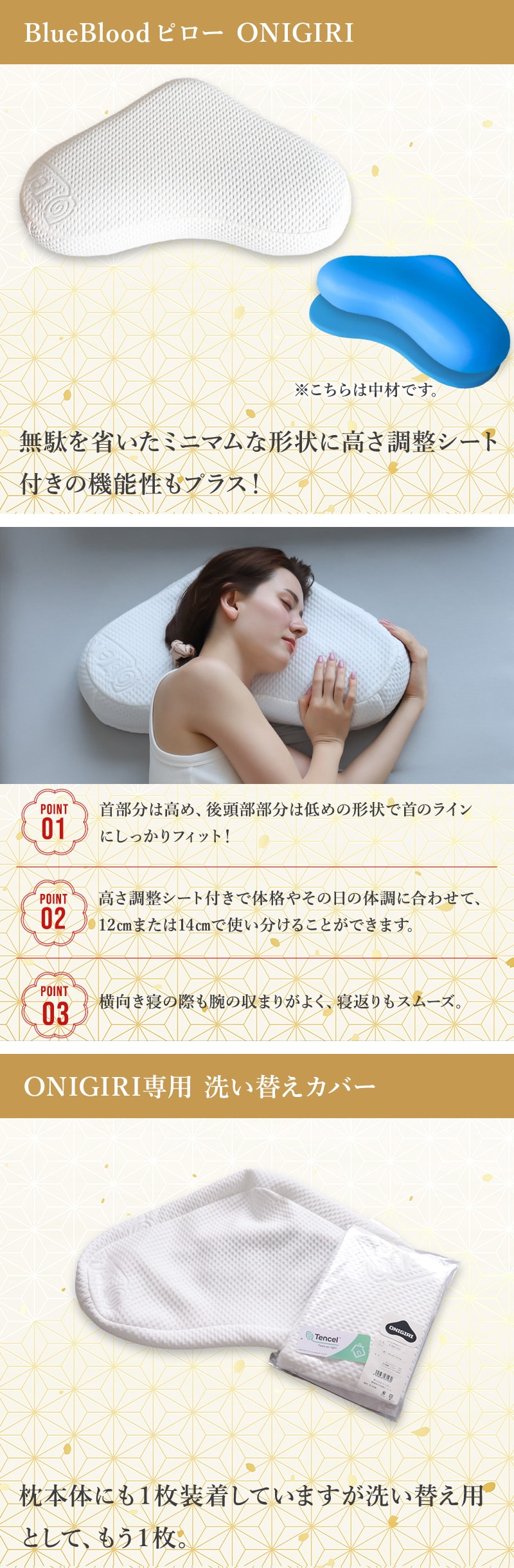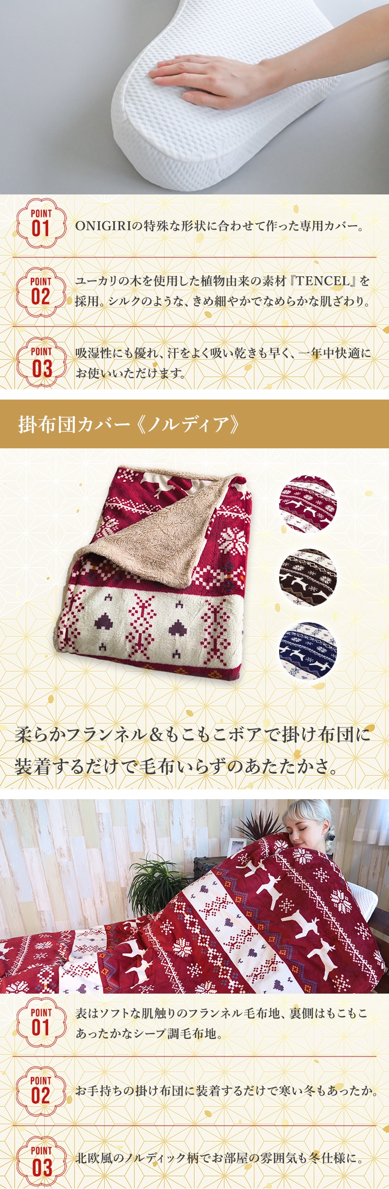 ・BlueBloodピロー ONIGIRI×1 ・ONIGIRI専用洗い替えカバー×1 ・掛布団カバー ノルディア×1 | |