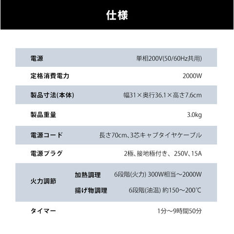 加熱調理:6段階(火力) 300W相当~2000W
