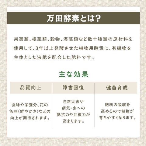 果実類、根菜類、穀物、海藻類など数十種類の原材料を使用して、3年以上発酵させた植物用酵素に、有機物を主体とした液肥を配合した肥料です。