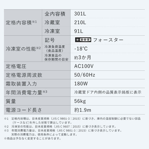 ※1:定格内容積は、日本工業規格(JIS C9801-3:2015)に基づき、庫内の温度制御に必要でない部品(ケースなど)を外した状態で算出しています。