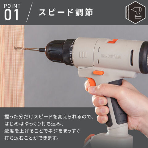 握る強さでスピードを変えられるので、はじめはゆっくり、徐々に速度を上げることで、ネジをまっすぐに打ち込むことができます。