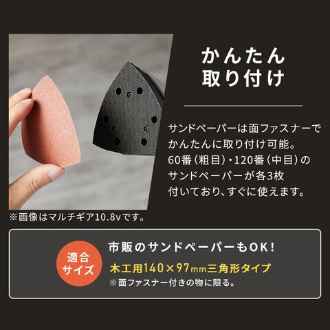 面ファスナーがついている、140×97mm三角形タイプの木工用サンドペーパーが使用できます。